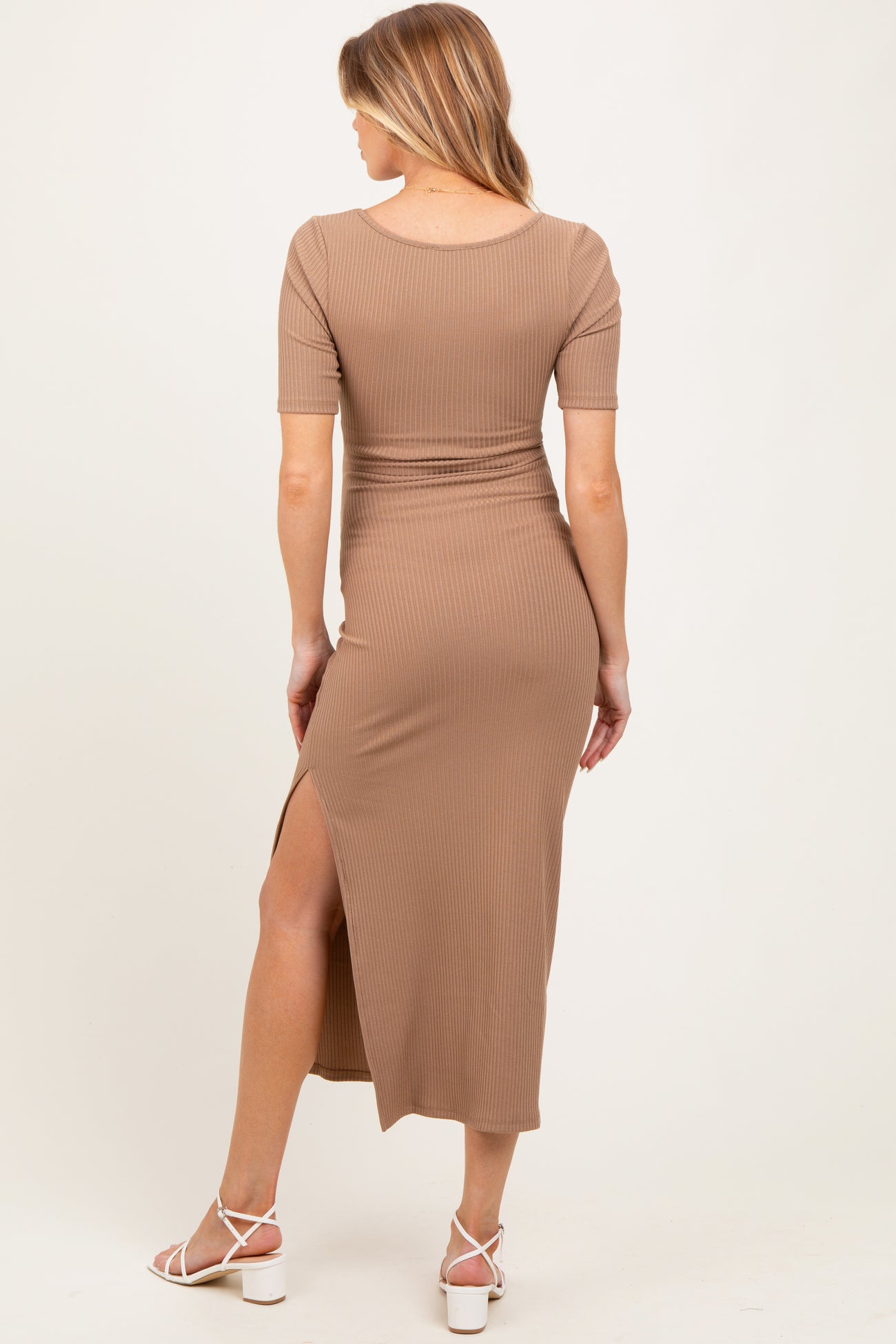 Light Taupe Ribbed Short Sleeve Side Slit Maternity Midi Dress