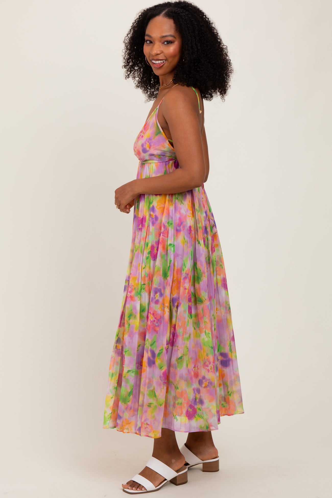 Lilac Floral Pleated Open Back Maxi Dress