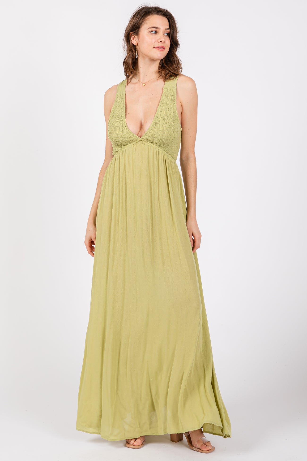 Details A solid maxi dress featuring a smoked top, deep v-neckline, criss cross adjustable back ties, side pockets, and an open back. Content + Care