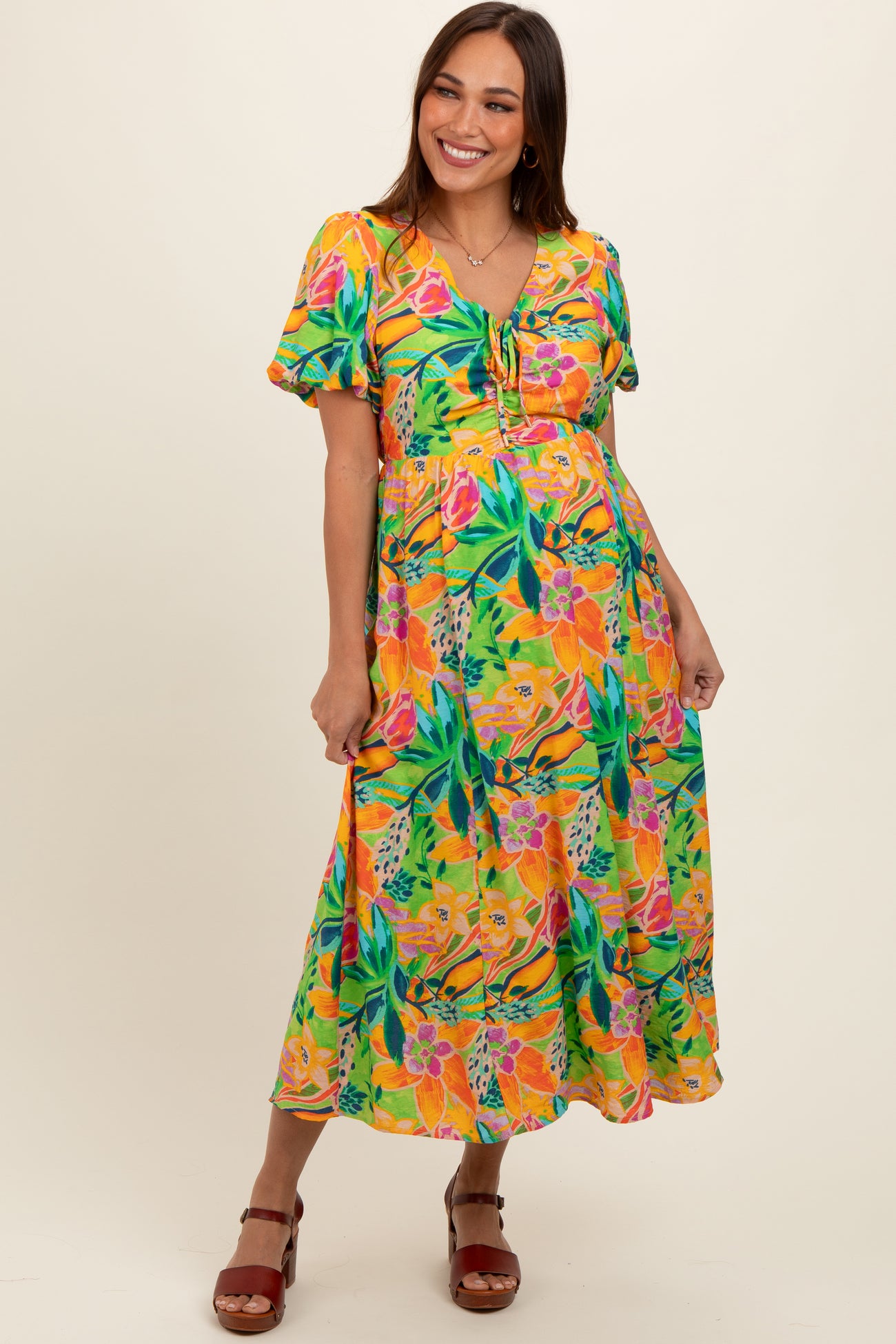 Lime Floral Puff Sleeve Maternity Midi Dress