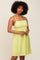 A striped dress with a straight neckline, adjustable straps, and a smocked back. Dress is lined.