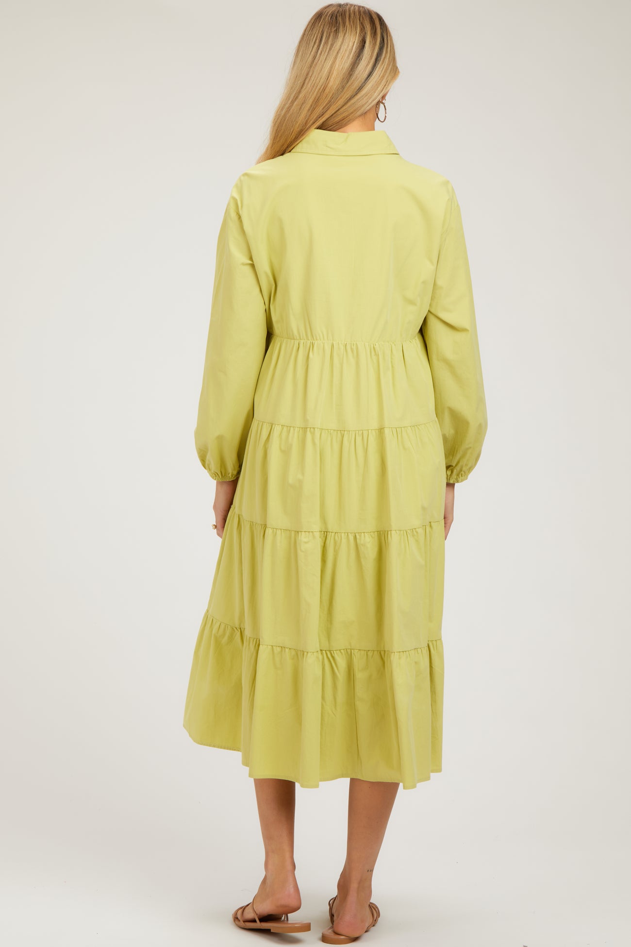A solid maternity midi dress featuring functioning top buttons, a collar, long sleeves, side pockets, and a tiered skirt. Body is fully lined.