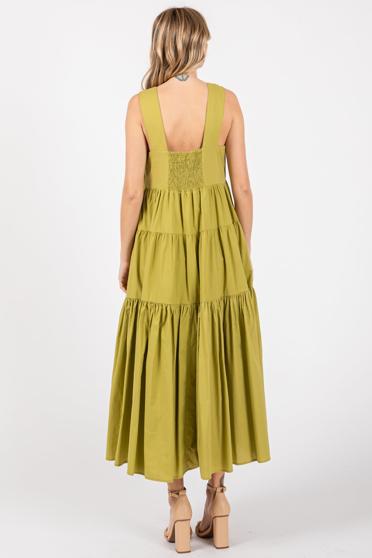 Details A sleeveless maxi dress featuring a square neckline, tiered body, and side pockets. Content + Care