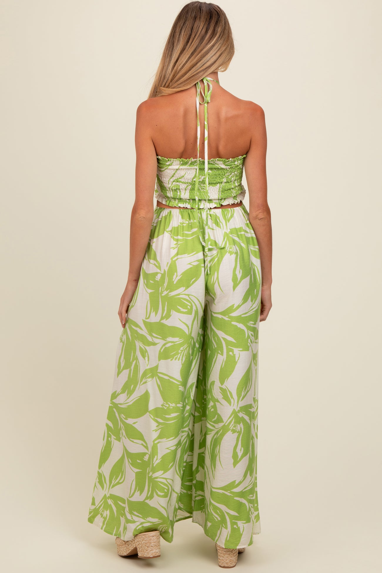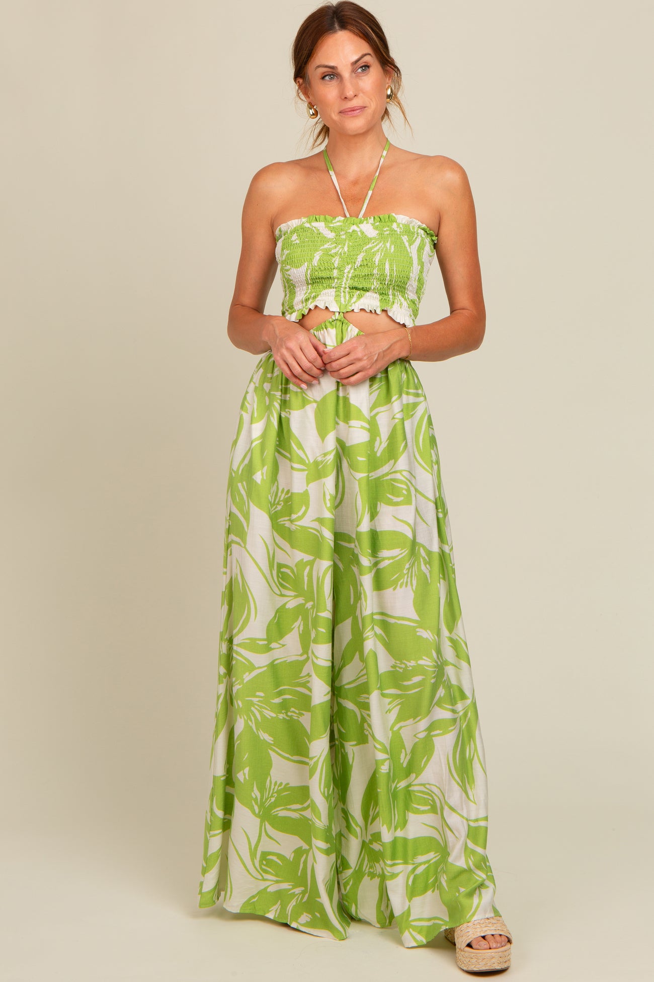 Lime Tropical Print Cutout Smocked Maternity Jumpsuit