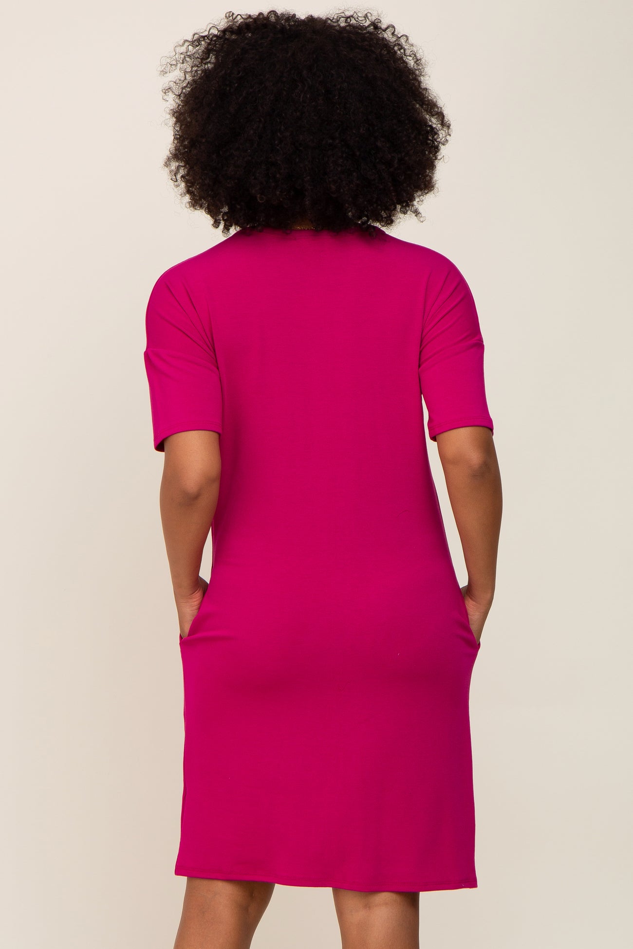 A solid hued dress featuring front button accents, short sleeves, side pockets and a v-neckline.