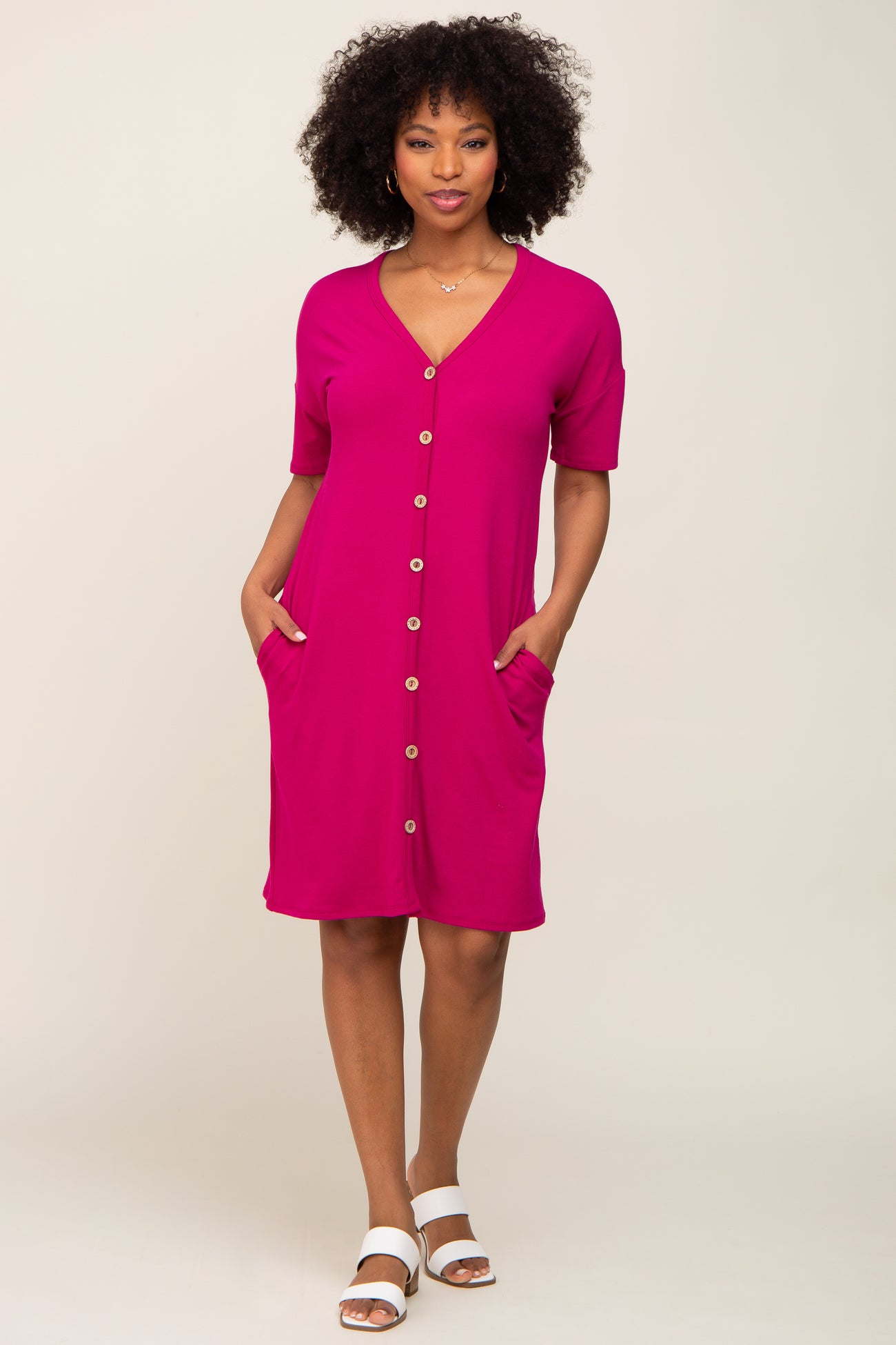 Magenta Button Accent Short Sleeve Maternity Dress