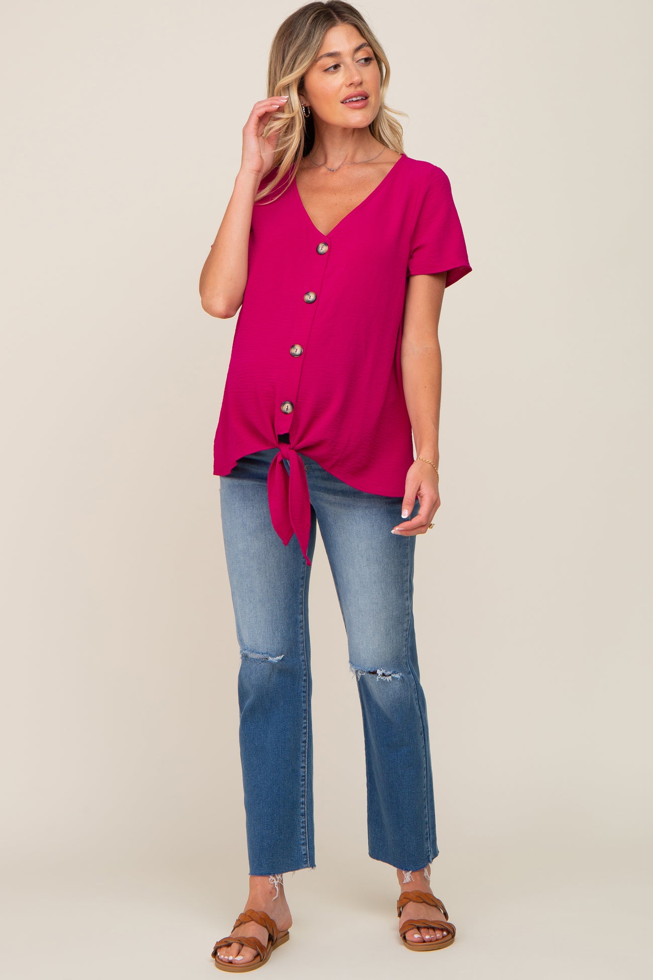 A solid hued maternity top featuring a button accent on front, a tie accent on hemline, a v-neckline, and short sleeves.