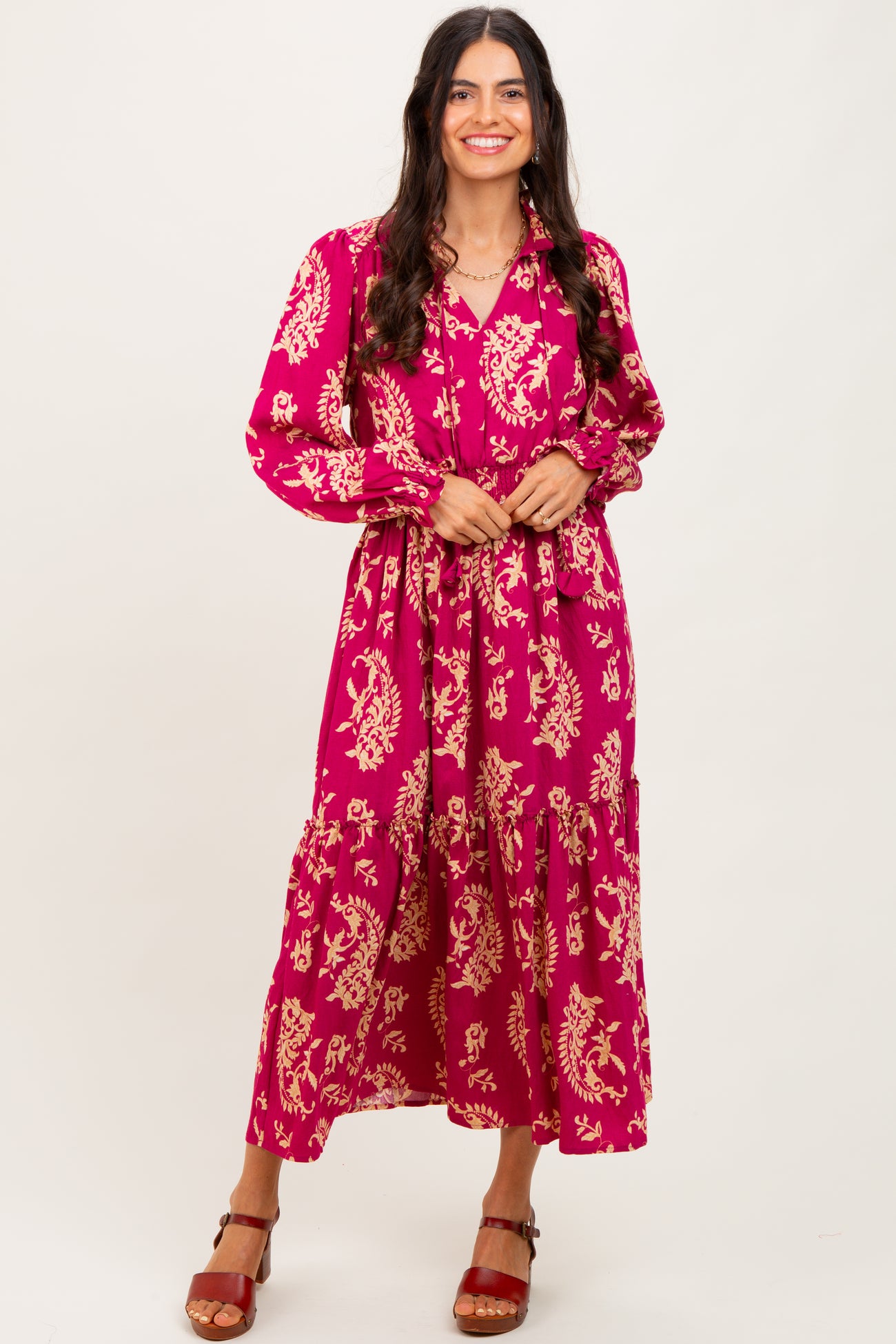 Elevate your wardrobe with this stunning Magenta Damask Front Tie Smocked Waist Midi Dress. Featuring a vibrant magenta base with elegant beige damask patterns, this dress combines classic charm with modern style. The flattering smocked waist enhances your silhouette, while the front tie detail adds a playful touch. Long, billowy sleeves with gathered cuffs create a romantic vibe, and the midi length offers versatile wear from day to night. Perfect for brunch, garden parties, or casual outings, this lightweight dress pairs beautifully with sandals or heels. Stay effortlessly chic and comfortable all season long!