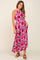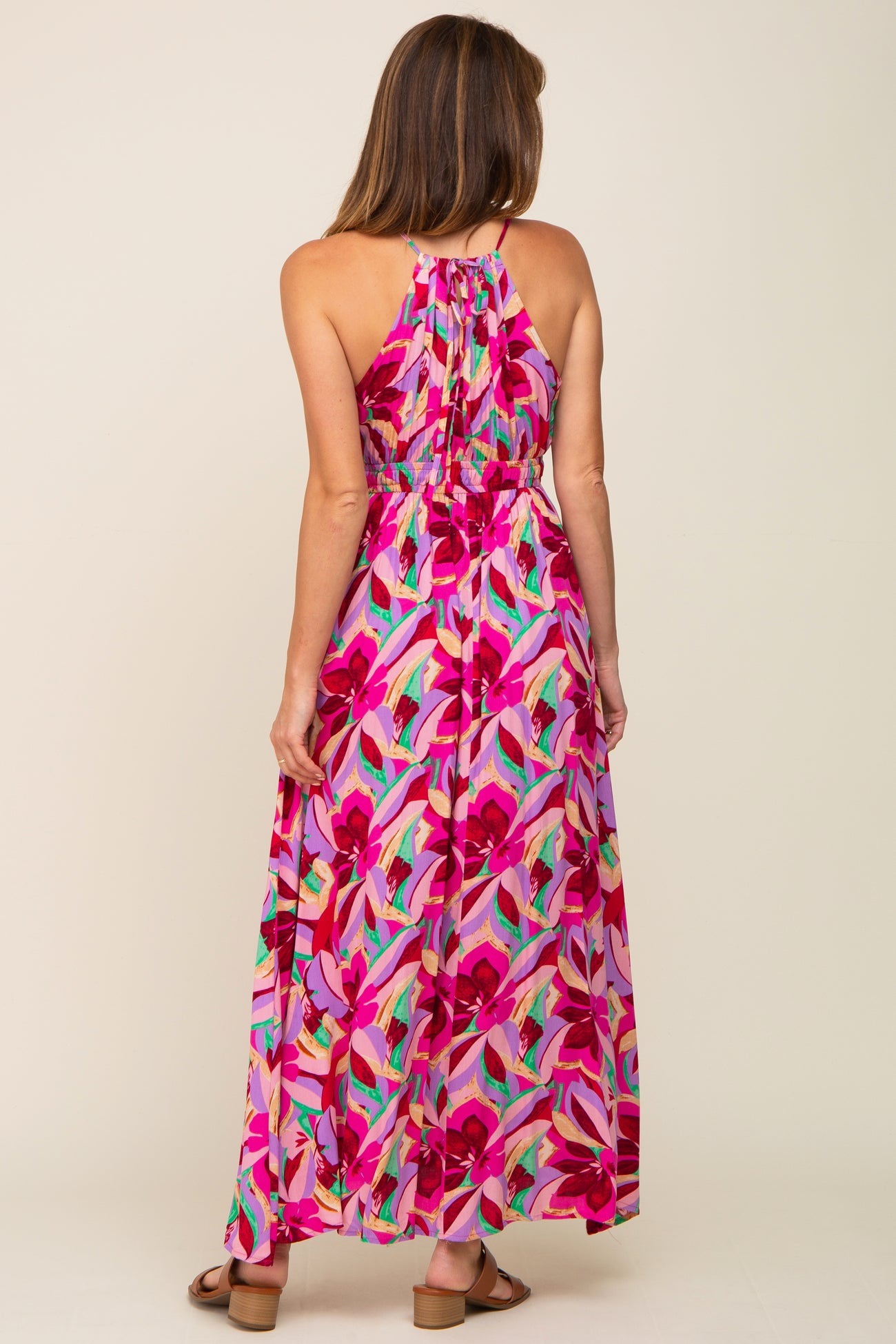 A floral maxi with an adjustable halter top, a straight neckline, and a shirred elastic waist.