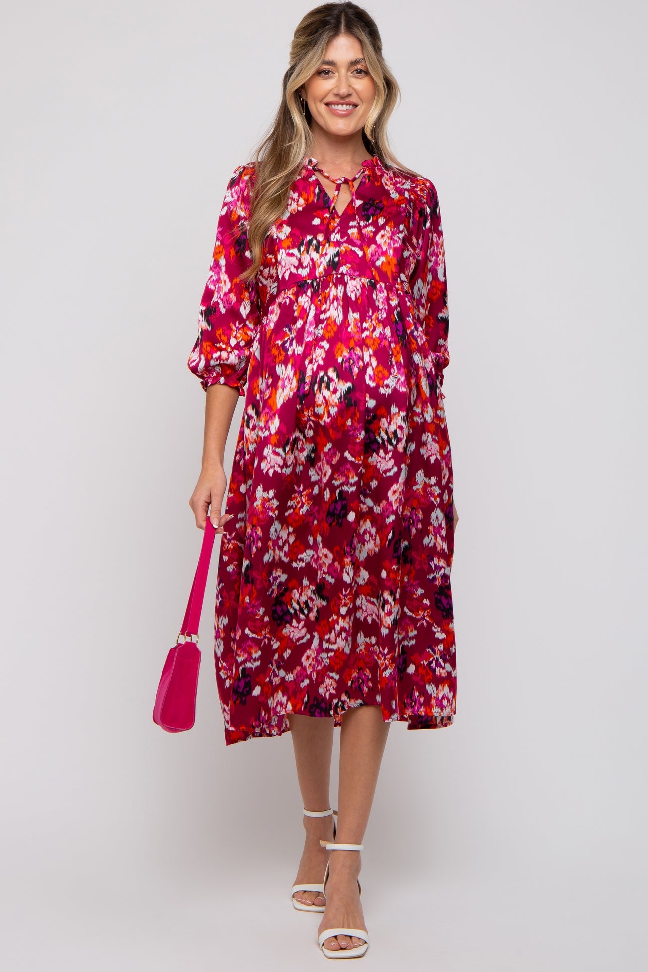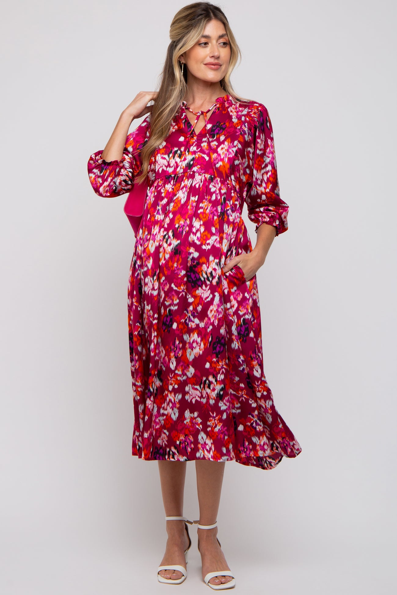 A floral print satin maternity midi dress featuring a ruffle neckline with a keyhole and an adjustable tie, an empire waist, 3/4 length sleeves and side pockets.