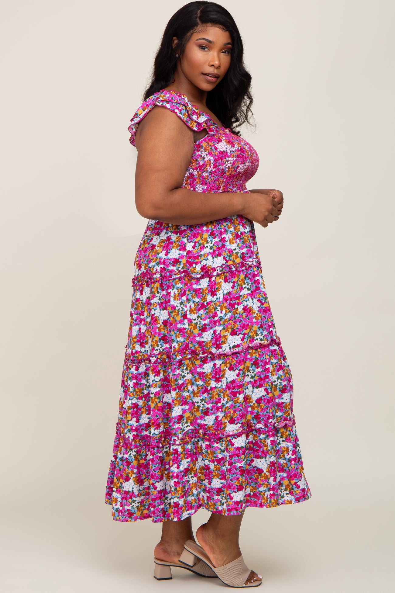 Magenta Floral Smocked Ruffle Tiered Midi Dress