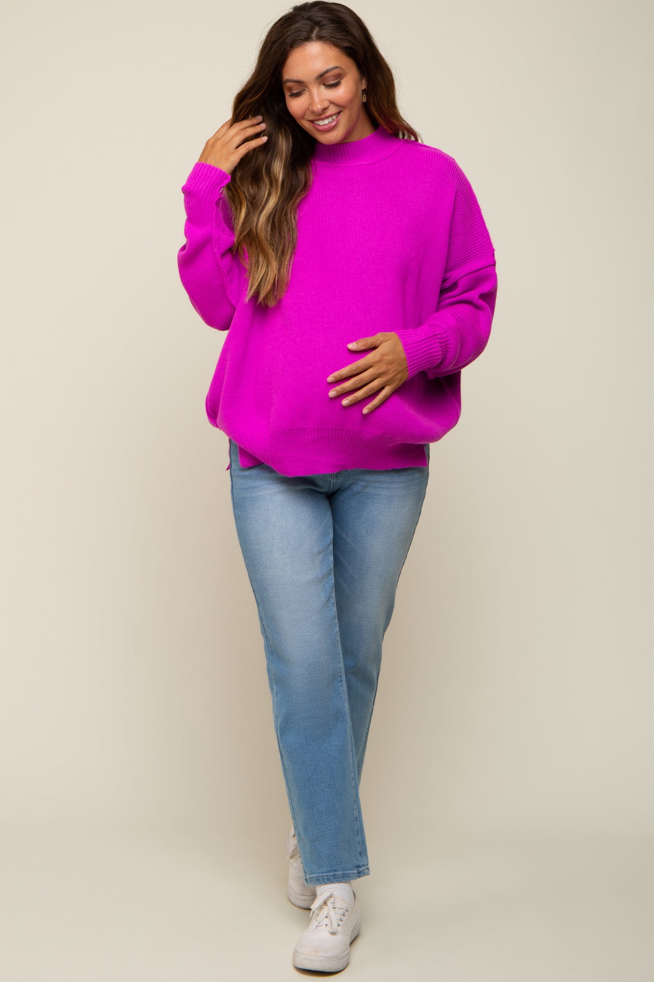 A knit maternity sweater featuring long sleeves, side slits and a mock neckline.