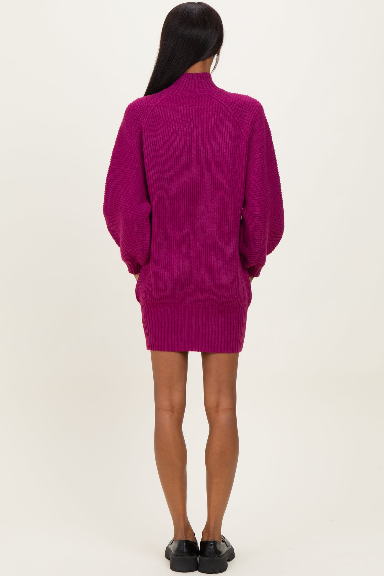 Elevate your wardrobe with this Magenta Mock Neck Sweater Mini Dress. Crafted from cozy, ribbed knit fabric, it features a flattering mock neck and voluminous balloon sleeves that add a chic, modern touch. The mini length and fitted cuffs create a balanced silhouette perfect for day-to-night wear. Pair it with chunky boots or sleek loafers for effortless style. This dress offers comfort, warmth, and bold color to brighten up any season. Ideal for casual outings, workdays, or weekend brunches—stay stylish and snug all day long! Available in multiple sizes.