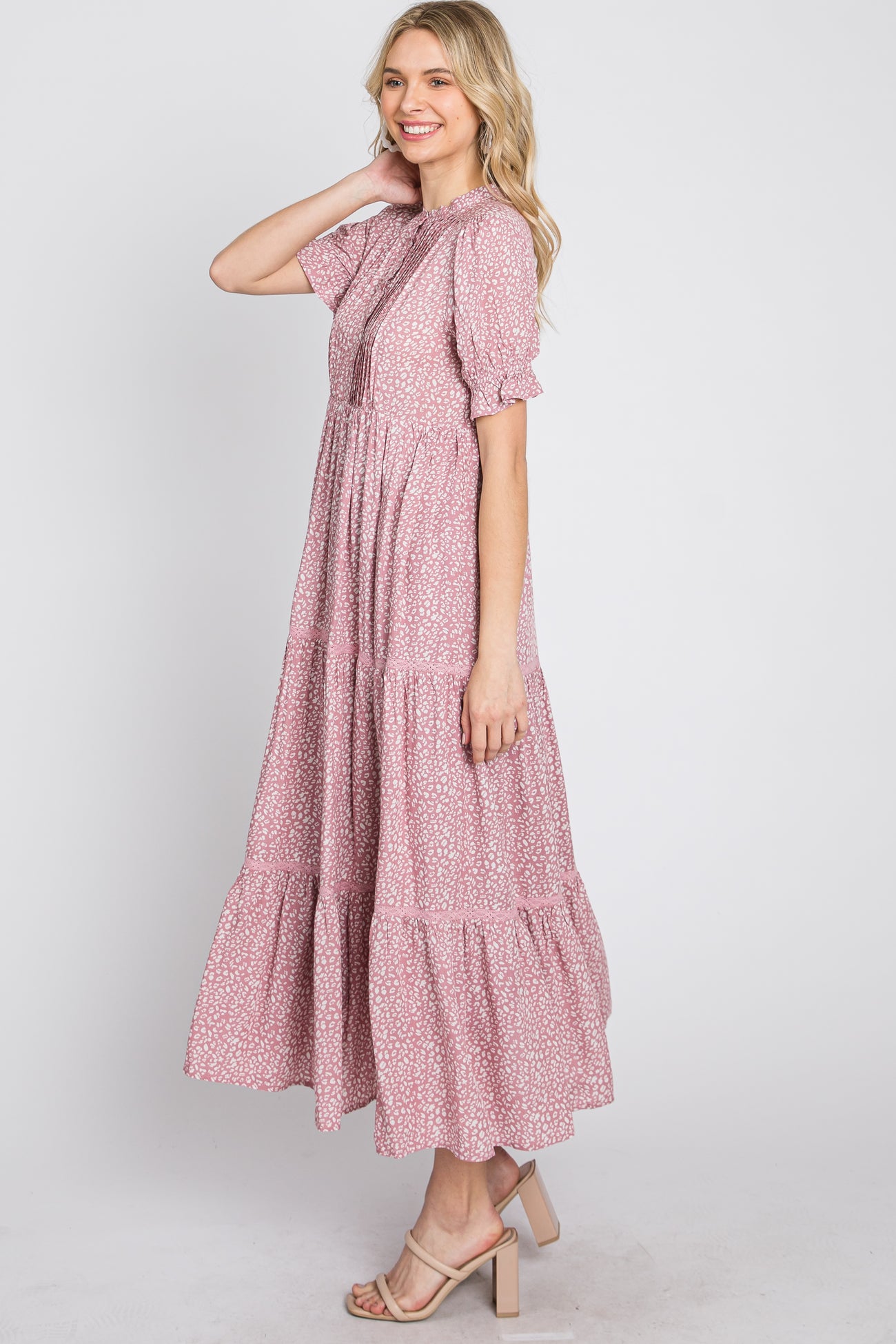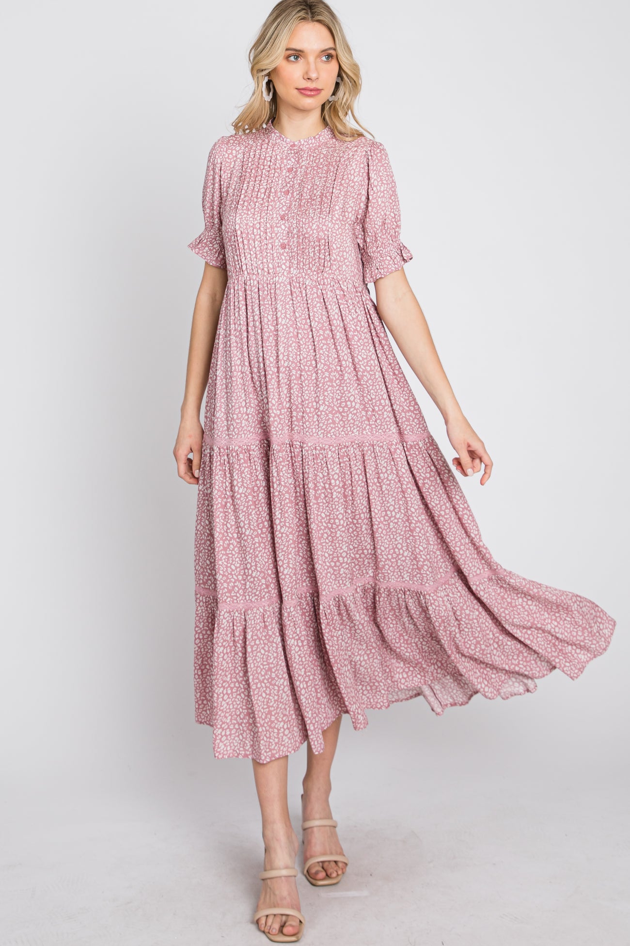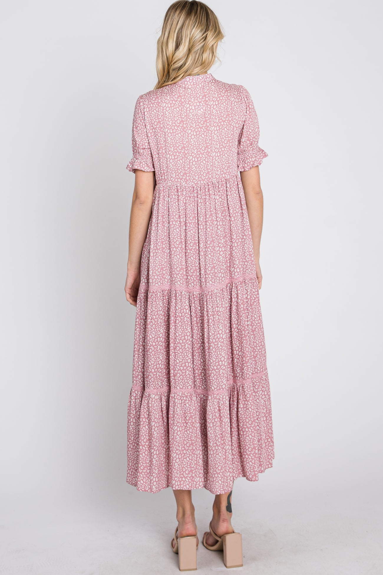 Details An animal print tiered midi dress featuring short puff sleeves, a button front and lace accents. Skirt is double lined. Content + Care
