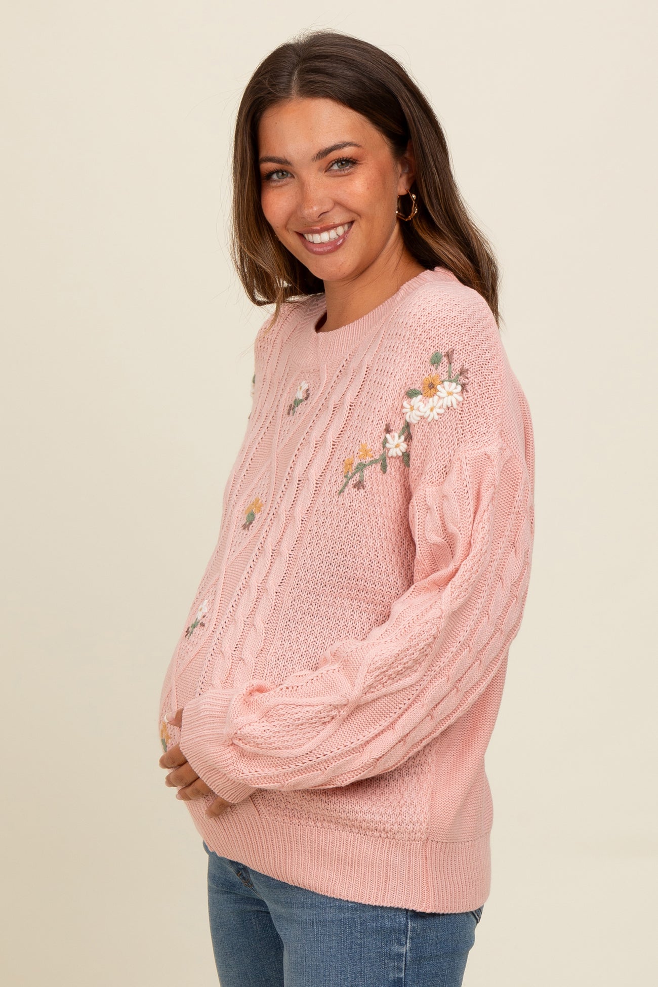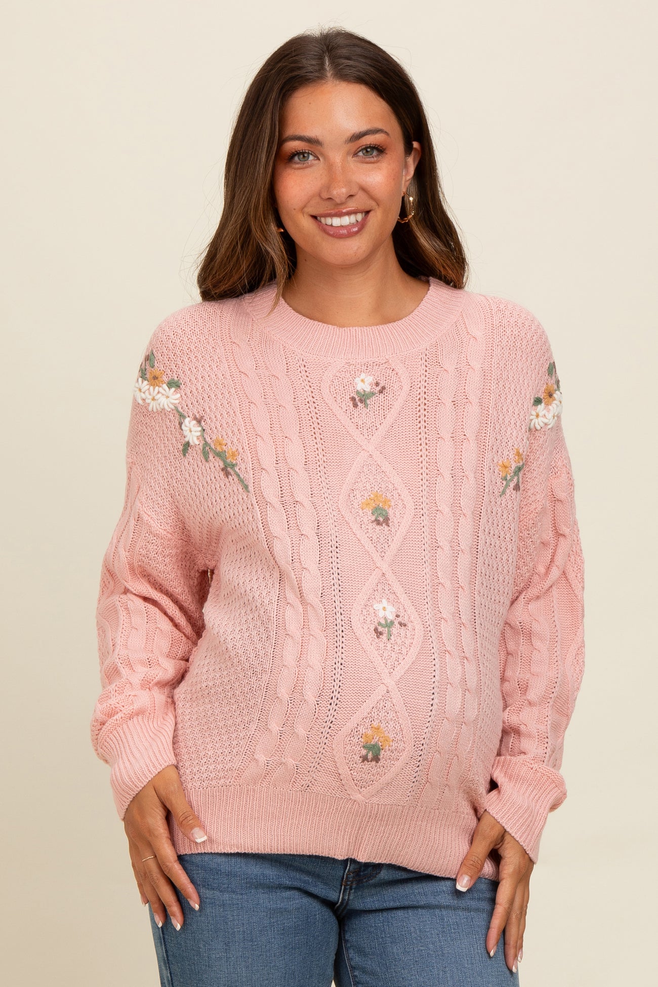 Mauve Embroidered Flower Cable Knit Maternity Sweater