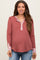 A waffle knit maternity top featuring a henley neckline, top accent buttons, and long sleeves with button accents. Also includes floral trim along the neckline and sleeve cuffs.