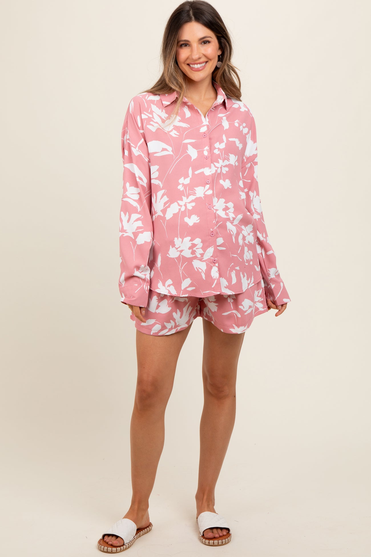 Mauve Floral Button Up Long Sleeve Maternity Short Set