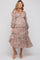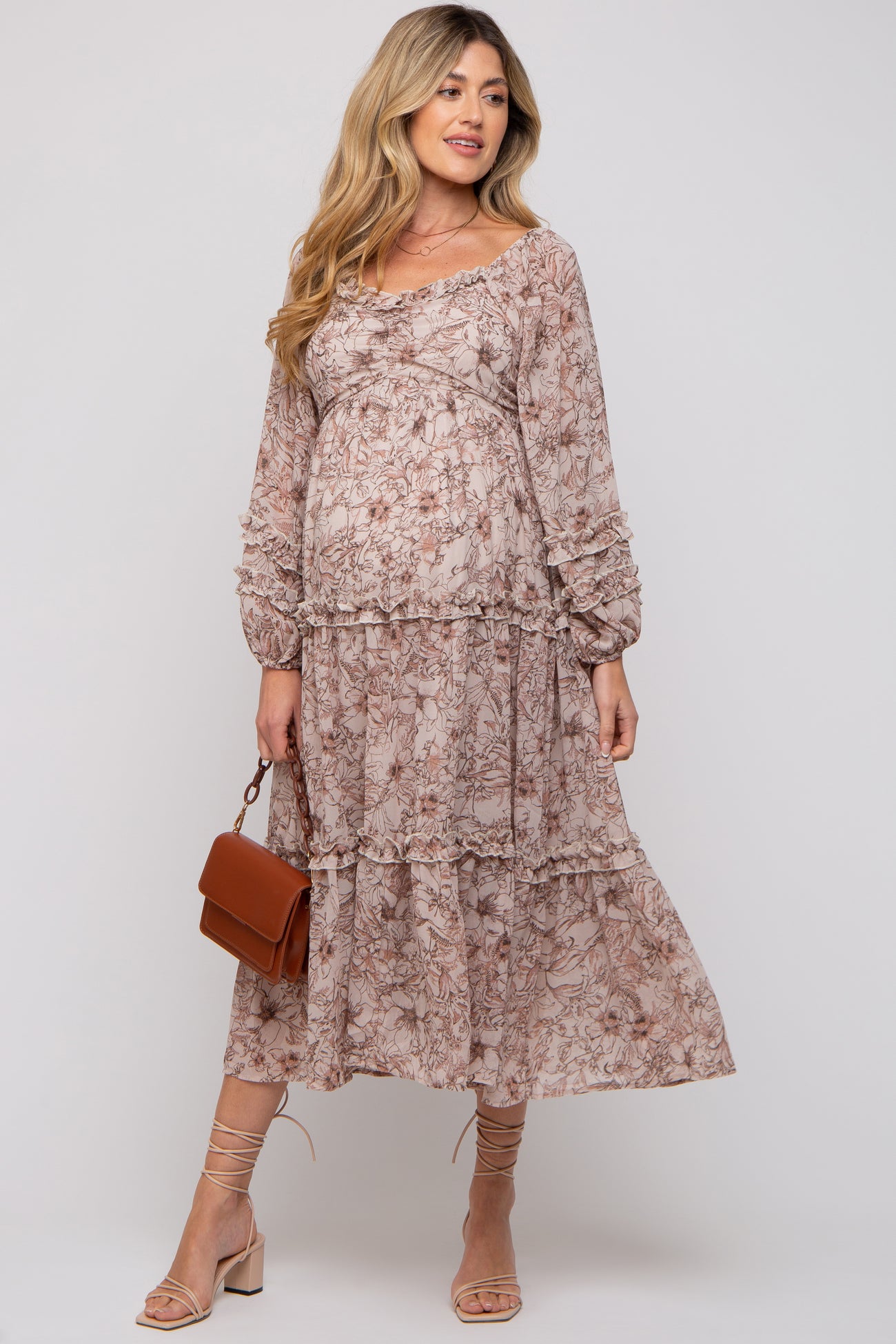 A floral print chiffon maternity midi dress featuring a sweetheart neckline, long puff sleeves, a smocked back, a tiered skirt and lettuce edge ruffle trim.