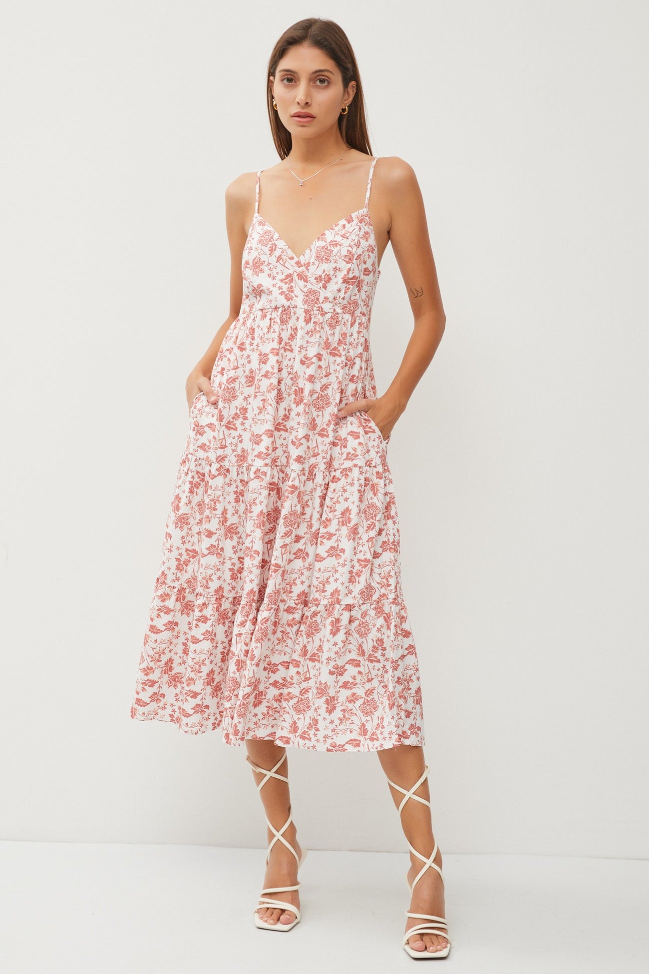 A floral maternity midi dress with a wrap top, adjustable straps, side pockets, and a tiered skirt. Dress is lined 2/3 of the way down.
