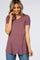 A solid hued short sleeve nursing top featuring a wrap front accent and a rounded neckline.