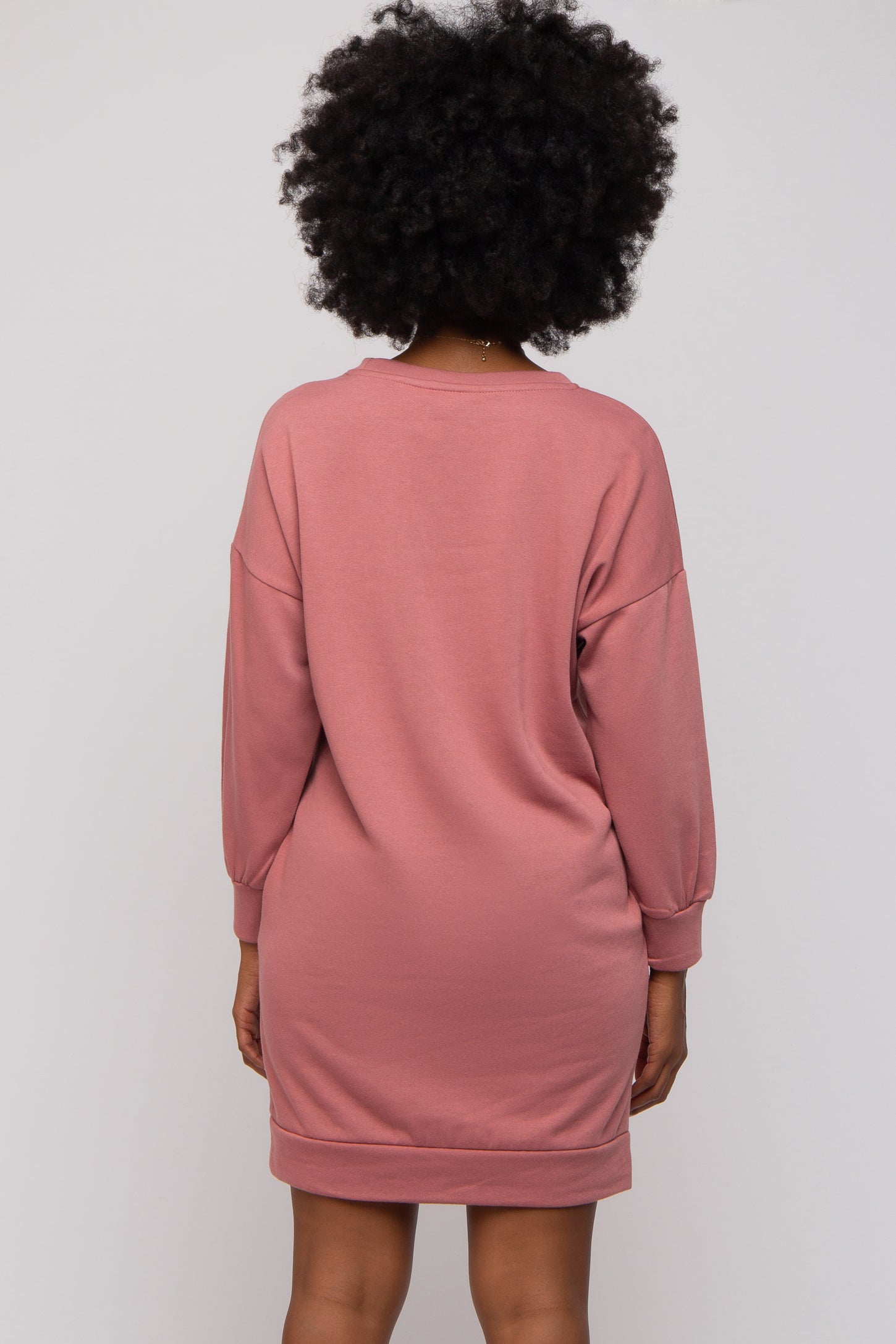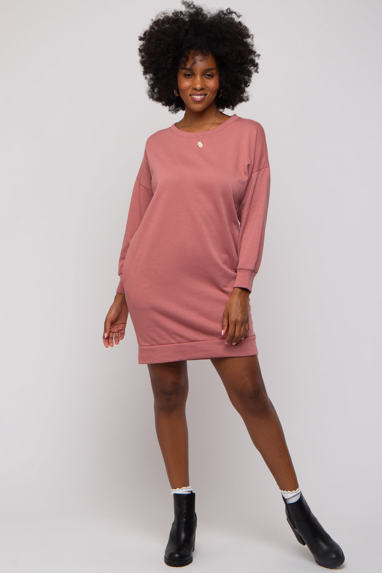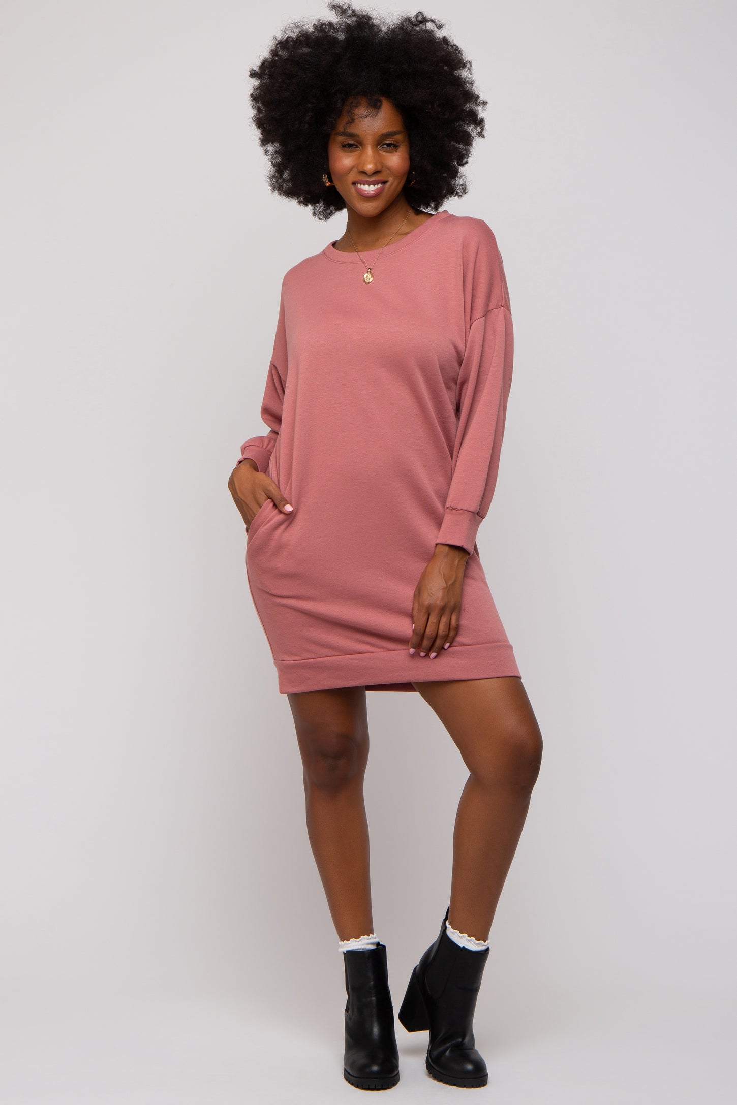 A solid fleece line dress featuring long sleeves, side pockets and a rounded neckline.