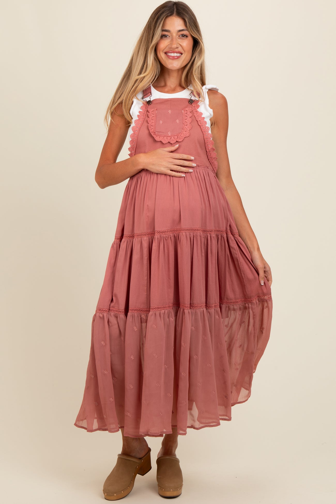 Mauve Overall Crochet Lace Tiered Maternity Dress
