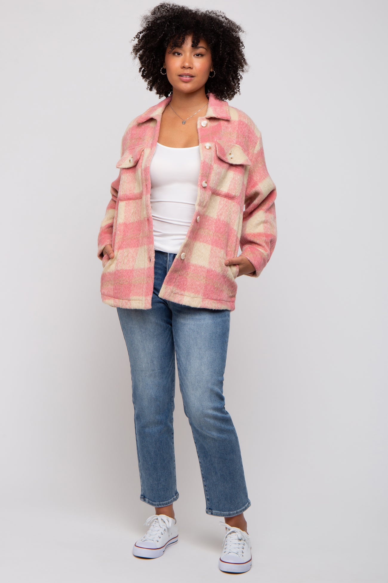 A plaid print fuzzy jacket featuring a collared neckline, a button up front, two front pockets, two side pockets and long cuffed sleeves.