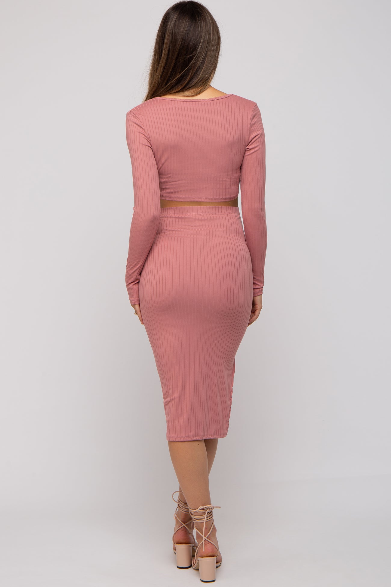 Mauve Ribbed Maternity Crop Top Midi Skirt Set