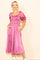 A solid satin midi dress with a smocked square ruffle accent bust, puff sleeves and side pockets.