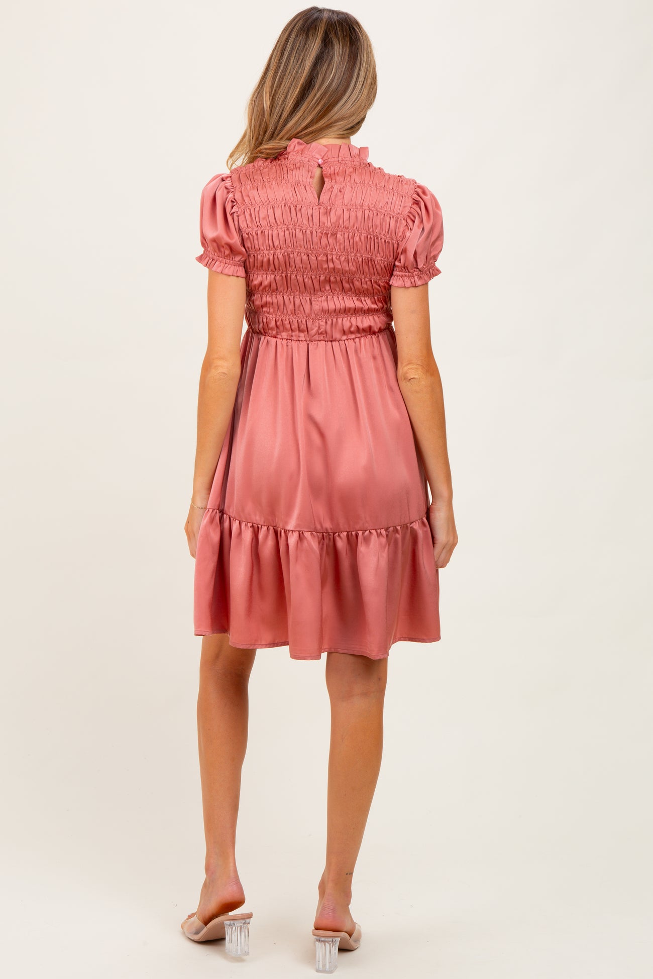 Embrace elegance and comfort with our Mauve Satin Smocked Mock Neck Maternity Dress. Featuring a luxurious satin finish, this dress offers a beautifully soft drape that flatters your pregnancy glow. The smocked bodice provides gentle stretch and support, perfectly accommodating your growing bump. Designed with a chic mock neck and puff sleeves, it blends vintage charm with modern style. The flowy skirt with a ruffled hem adds a playful touch, ideal for baby showers, date nights, or special occasions. Lightweight and breathable, this dress is a must-have for expecting moms who want to feel stylish and comfortable all day.