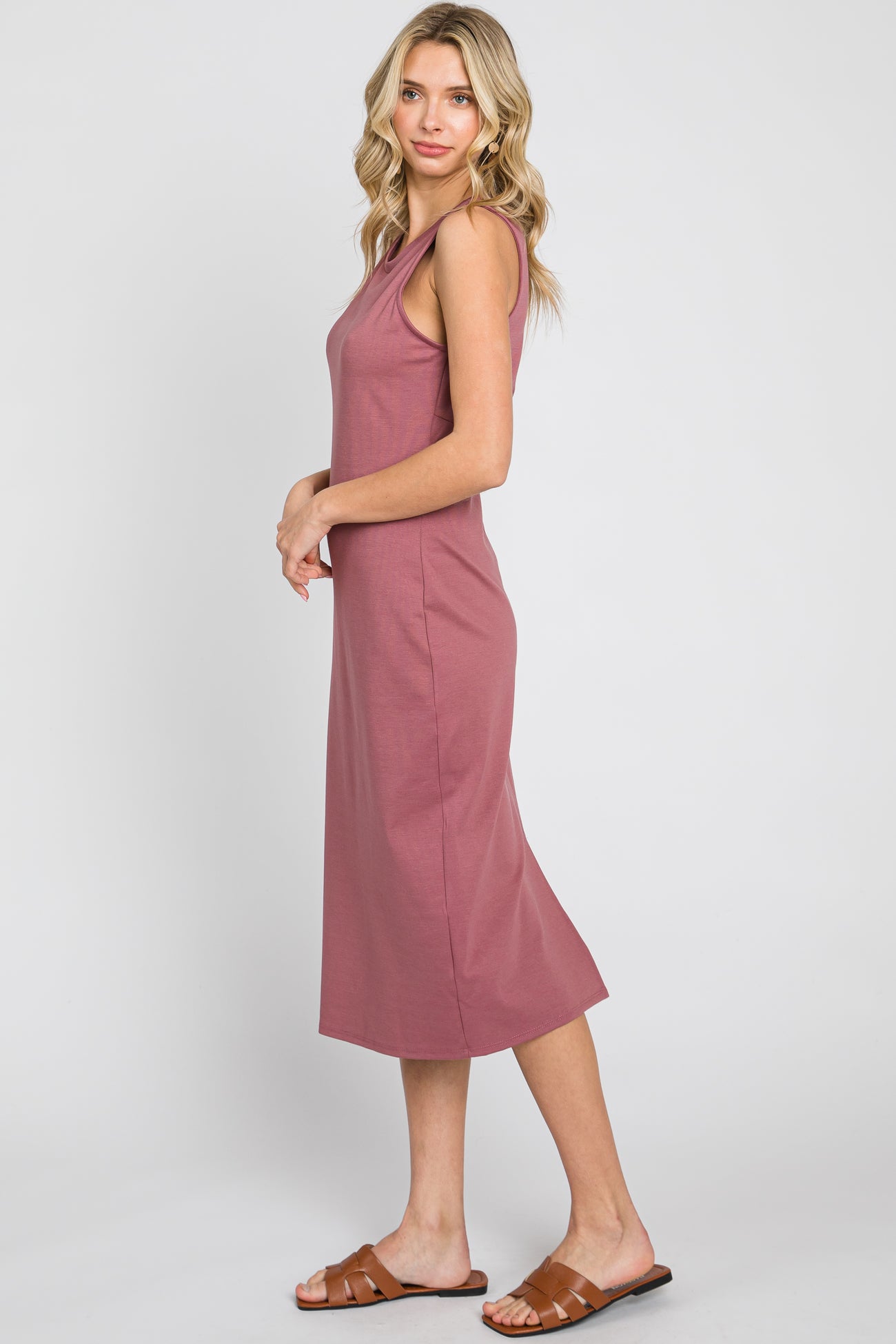 A solid, sleeveless midi dress. Features a rounded neckline, a back twist accent, a back cutout, and a center back hem slit.