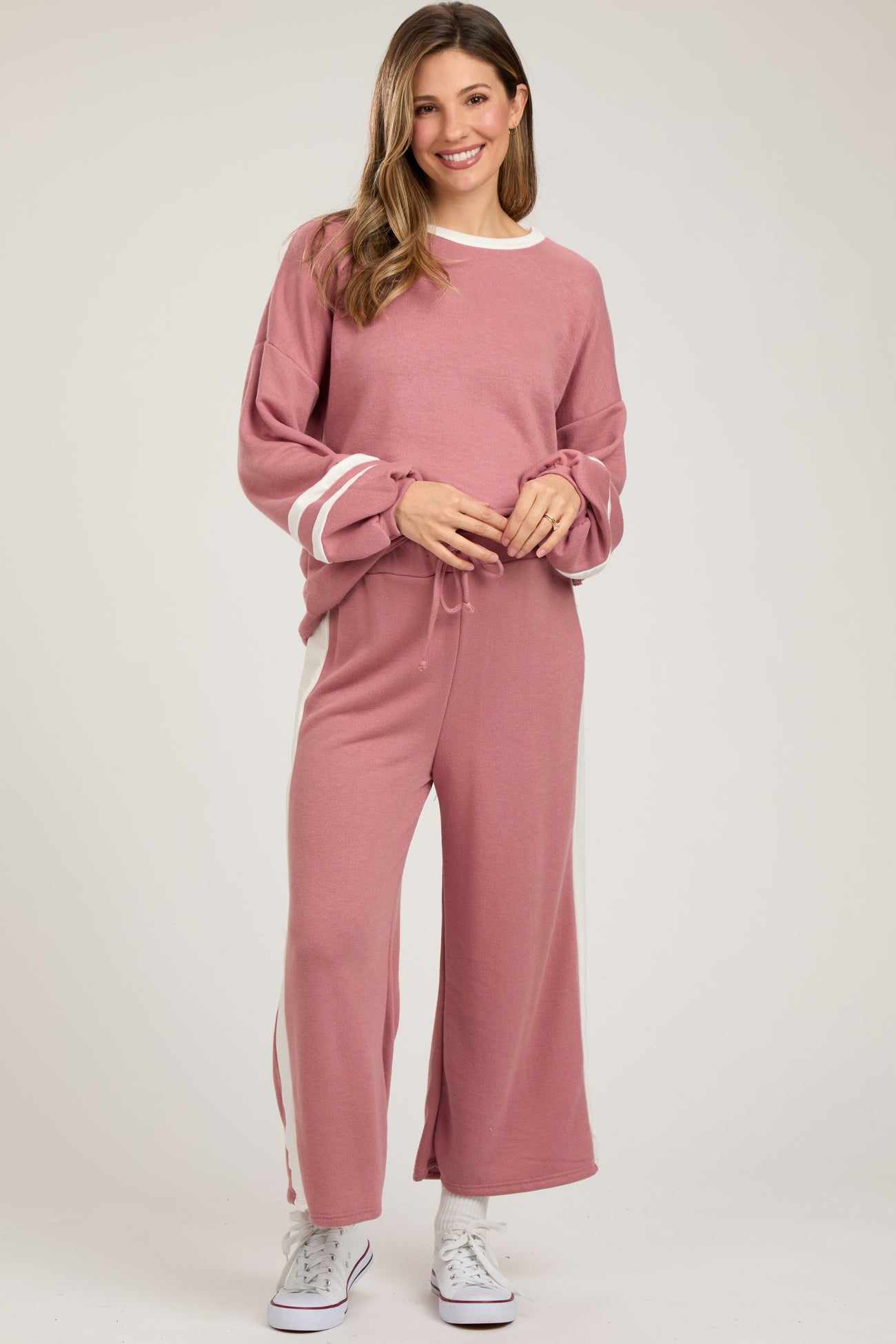 A striped maternity set featuring long sleeves and long pants with a self-tie drawstring.