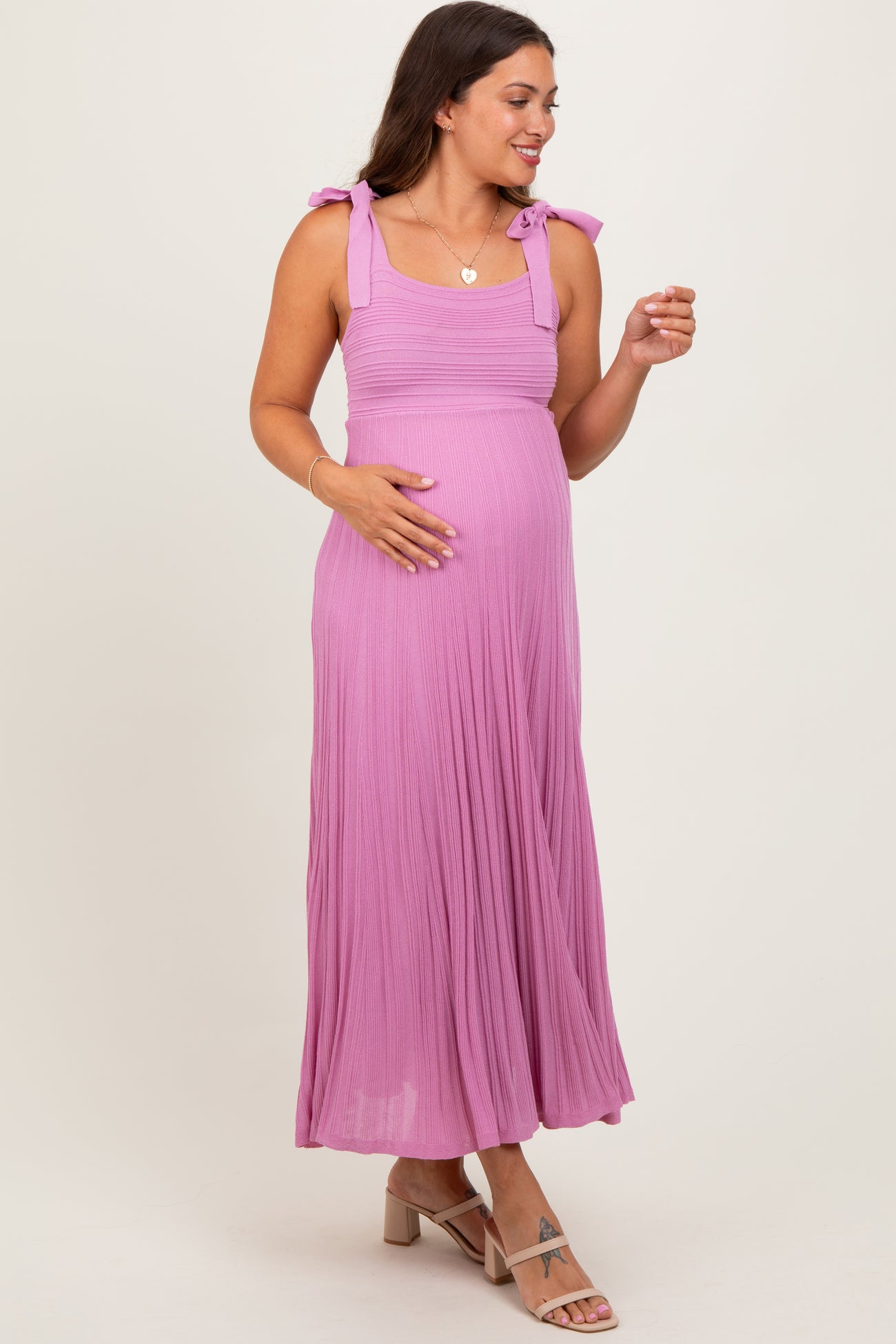 Embrace comfort and style with our Mauve Textured Knit Shoulder Tie Maternity Midi Dress. Crafted from soft, breathable fabric, this dress features a flattering textured knit design that gently stretches to accommodate your growing bump. The adjustable shoulder ties add a customizable fit and a charming touch to the scoop neckline. Its midi length offers elegant coverage perfect for any season or occasion. Whether you're attending a baby shower or enjoying a casual day out, this dress provides effortless maternity chic. Pair it with sandals or heels for a complete look you'll love throughout your pregnancy.
