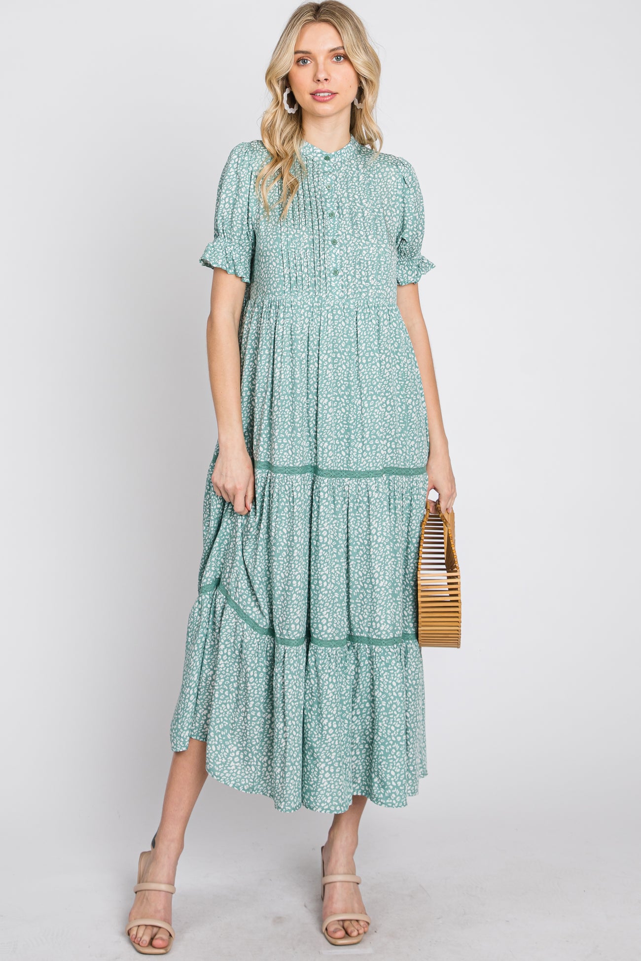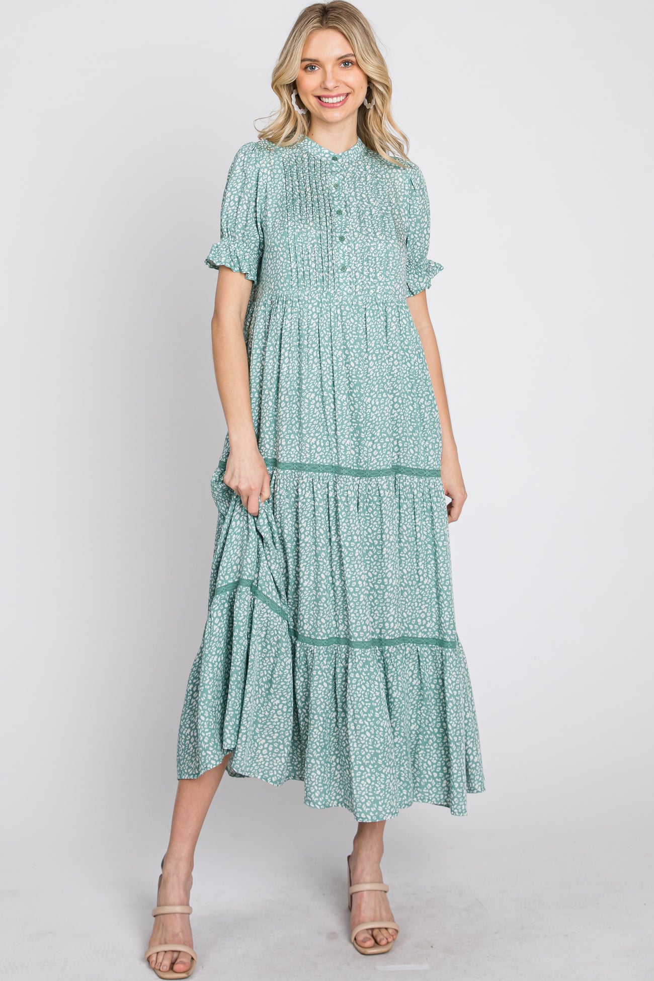 Mint Animal Print Button Front Tiered Midi Dress