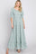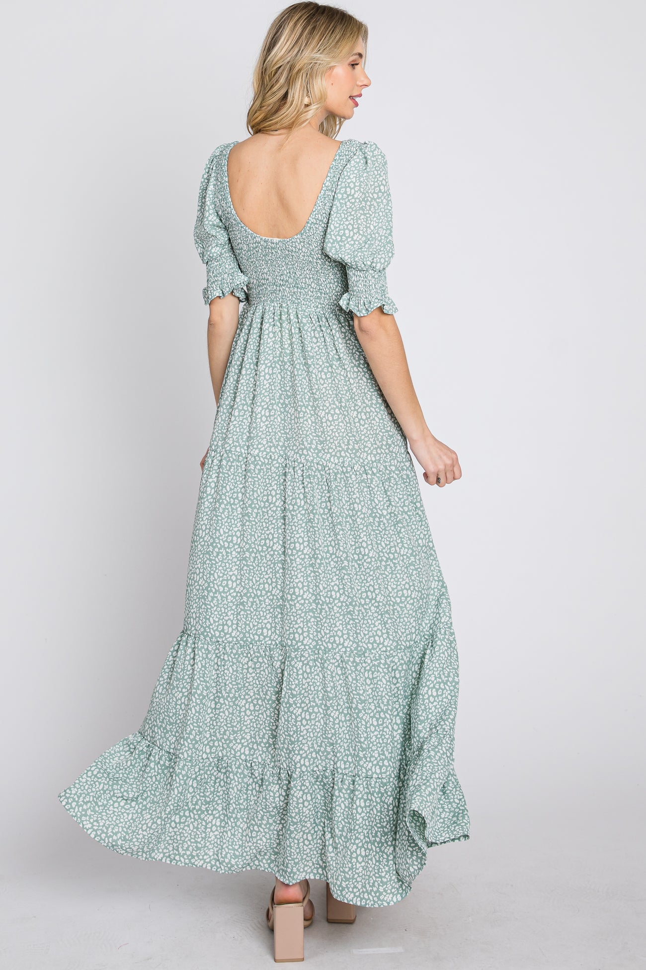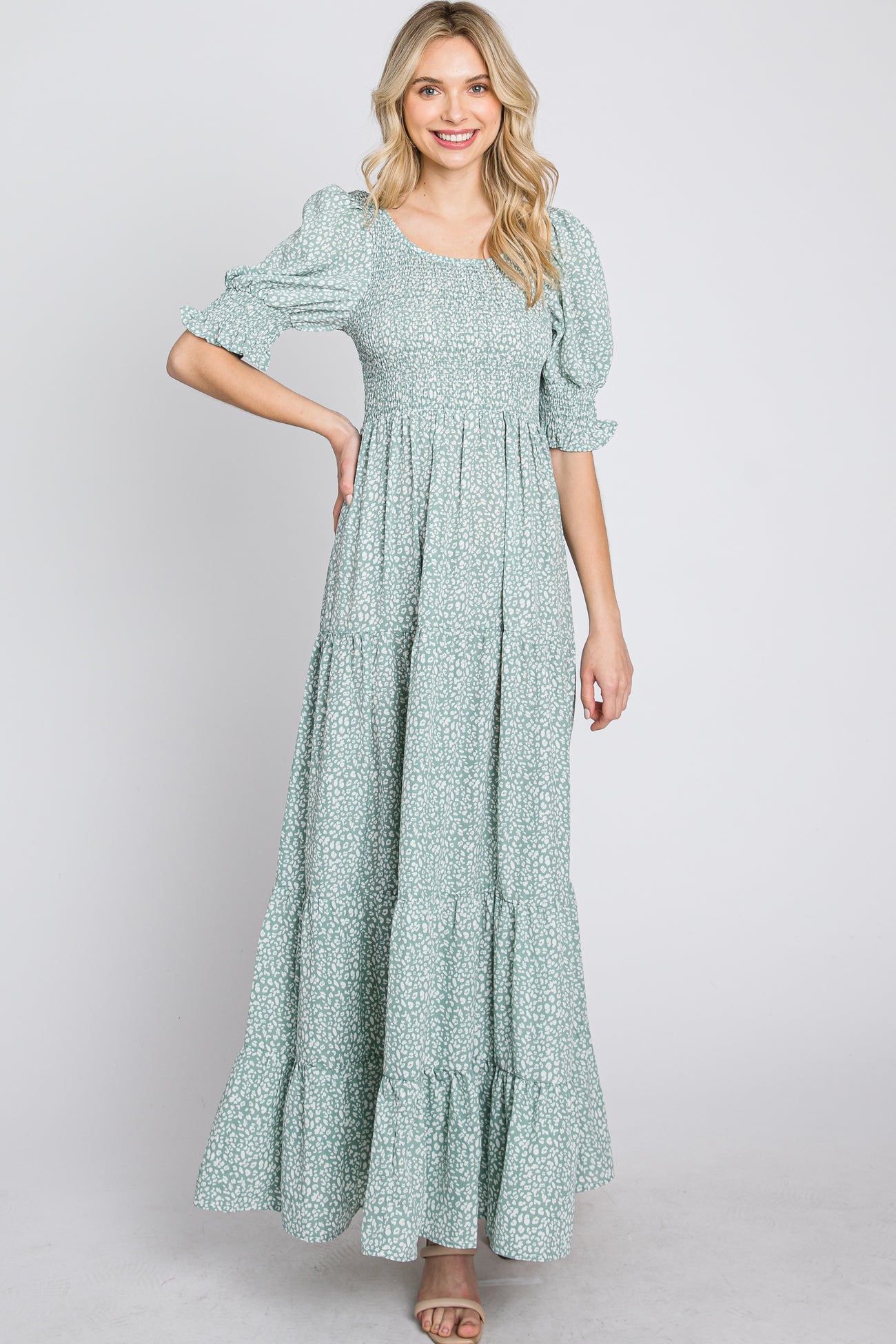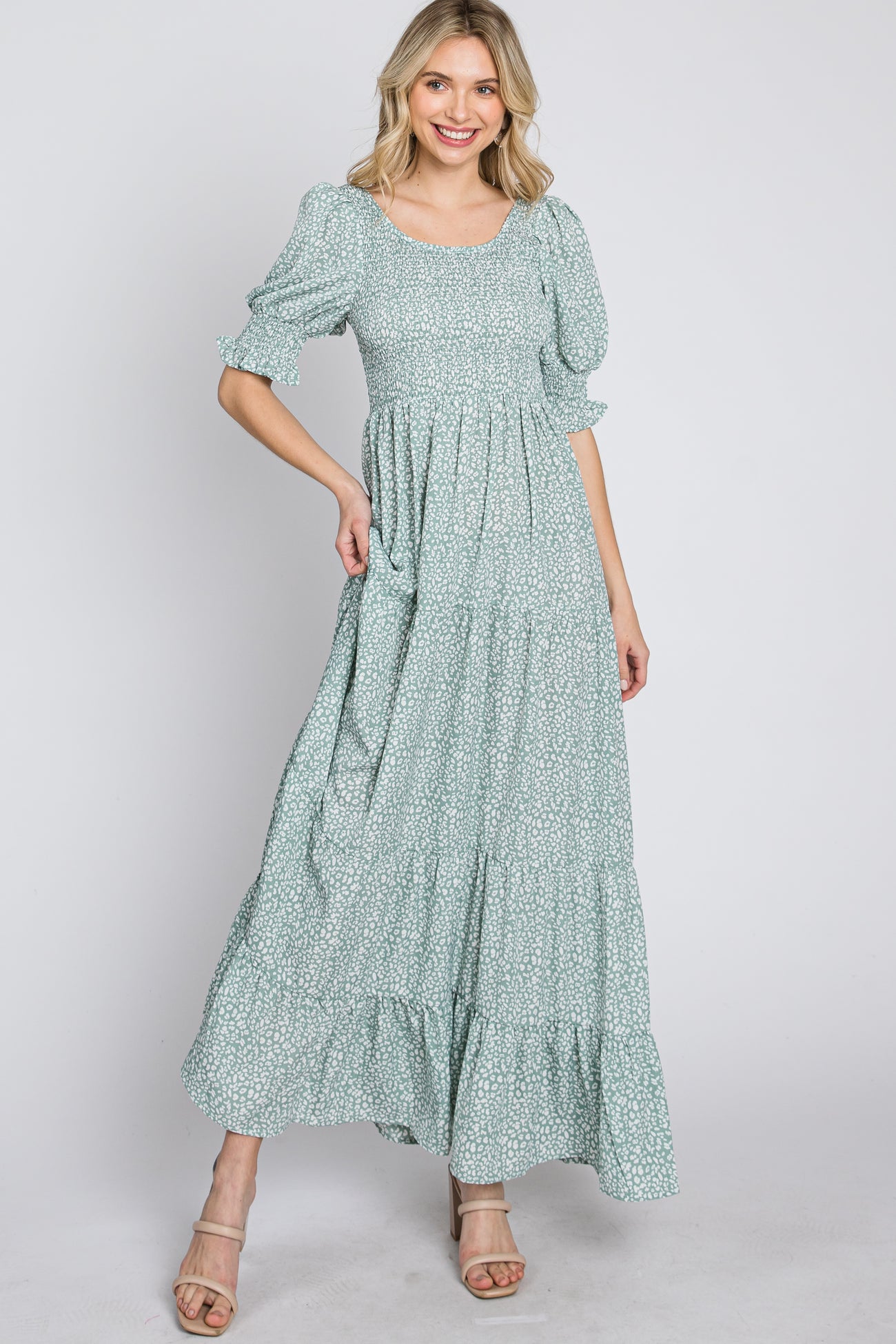 Details An animal print maxi dress featuring a smocked top, short puff sleeves, a tiered skirt and a rounded neckline. Content + Care