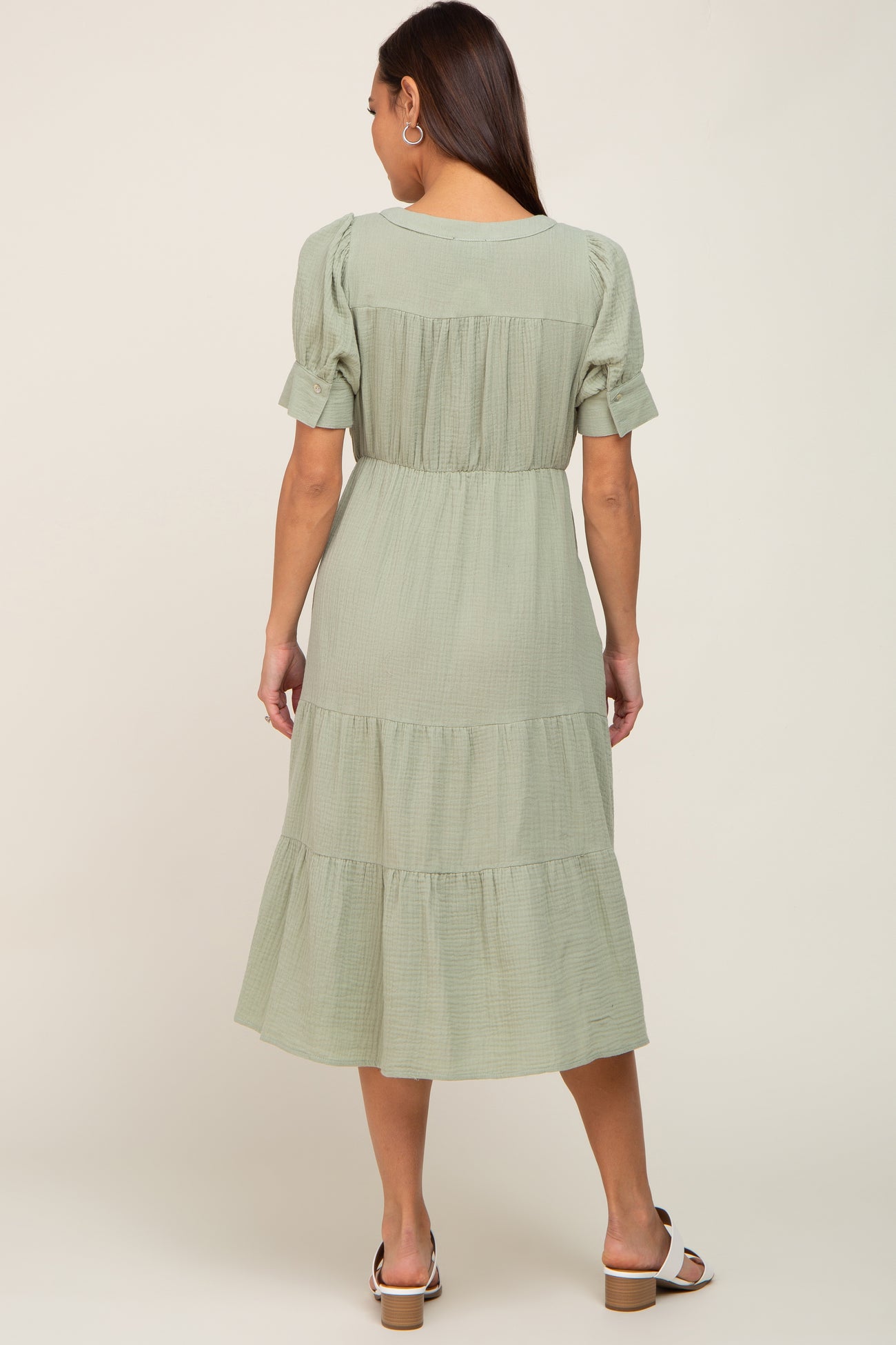 A maternity dress featuring a button down front, a tiered body, short puff sleeves, side pockets and a v-neckline.
