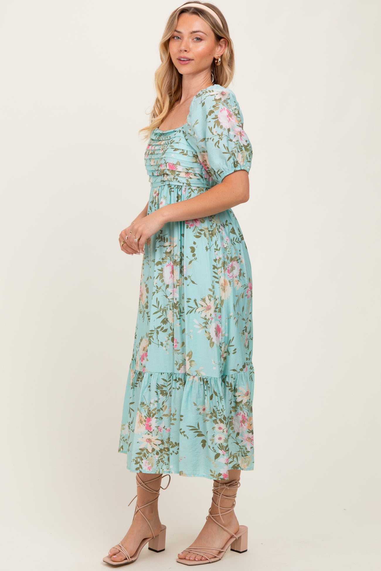Mint Floral Pleated Bust Puff Sleeve Midi Dress
