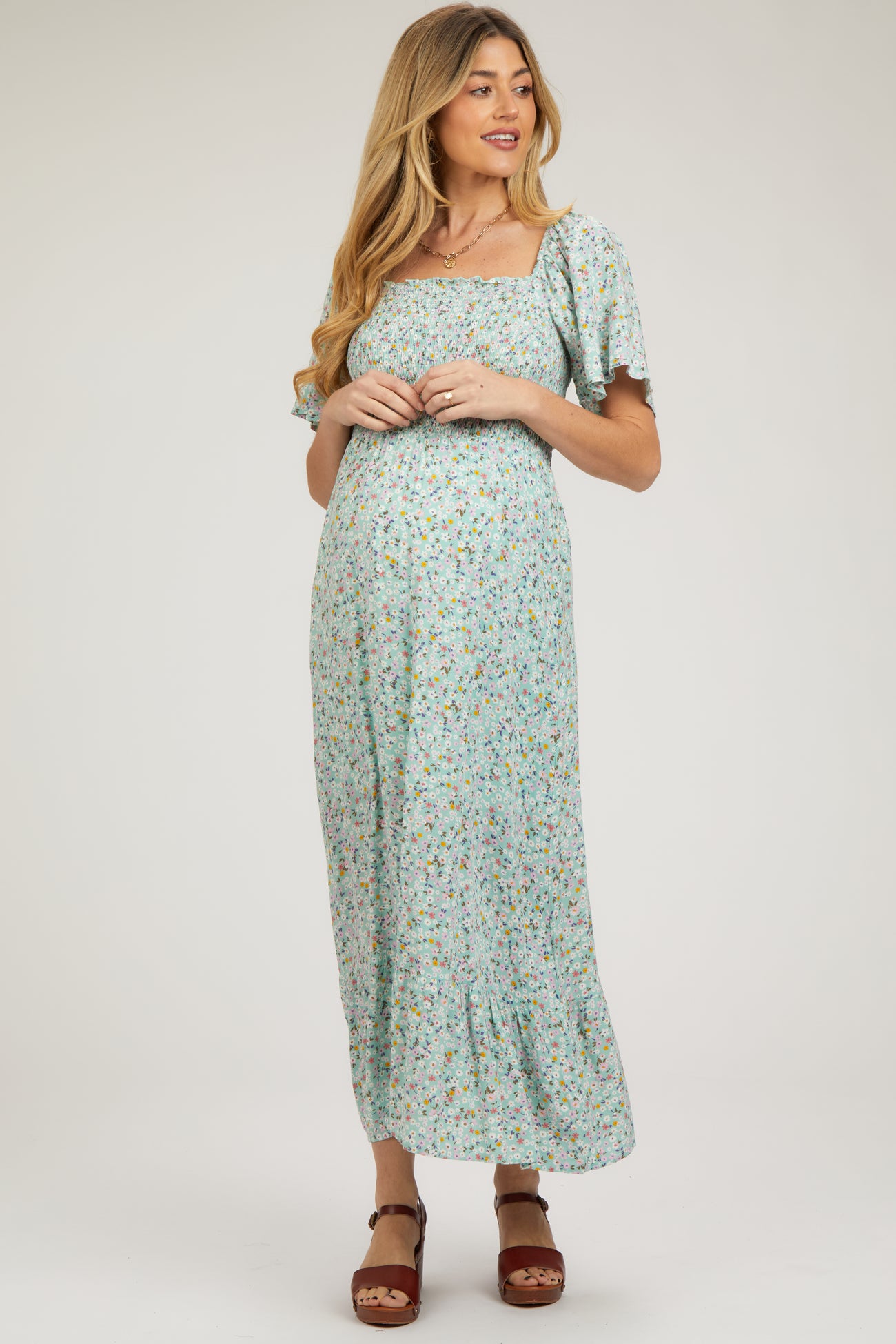 Mint Floral Smocked Maternity Maxi Dress