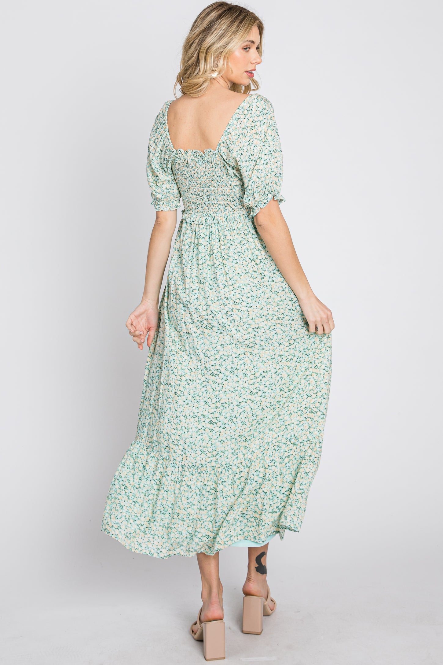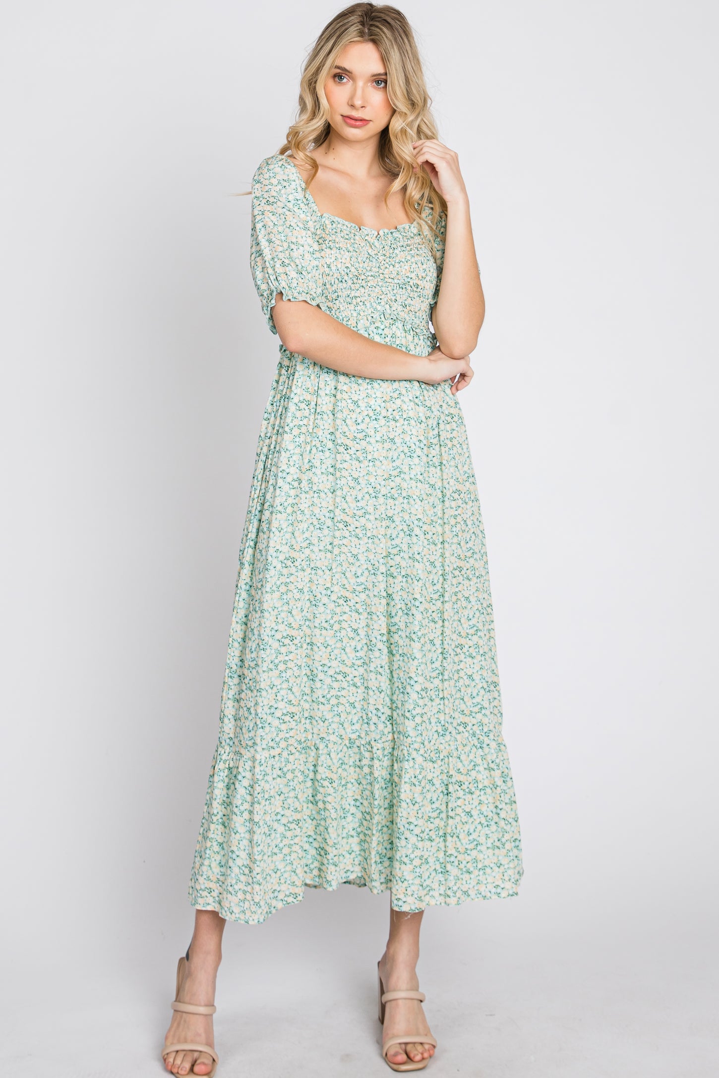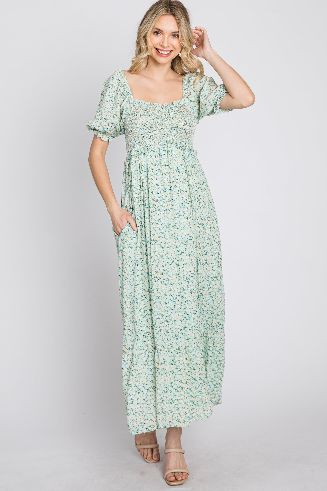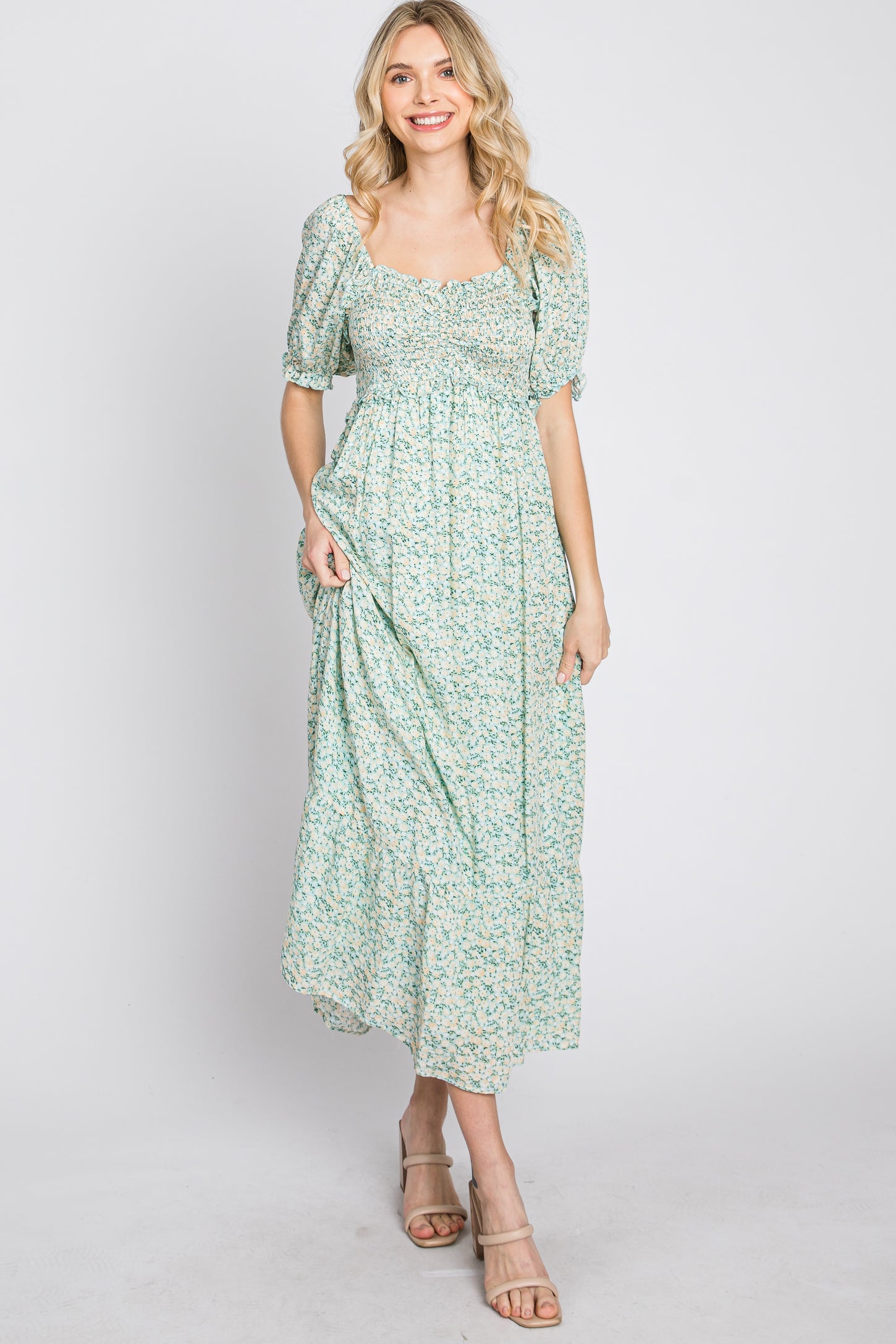 Details A floral print midi dress featuring a sweetheart neckline, a smocked top, shot puff sleeves, side pockets and a ruffle hem. Skirt is double lined. Content + Care