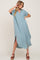 A solid maxi dress featuring functioning front buttons, a collar, two front pockets, cuffed short dolman sleeves, and a hi-low rounded hemline.