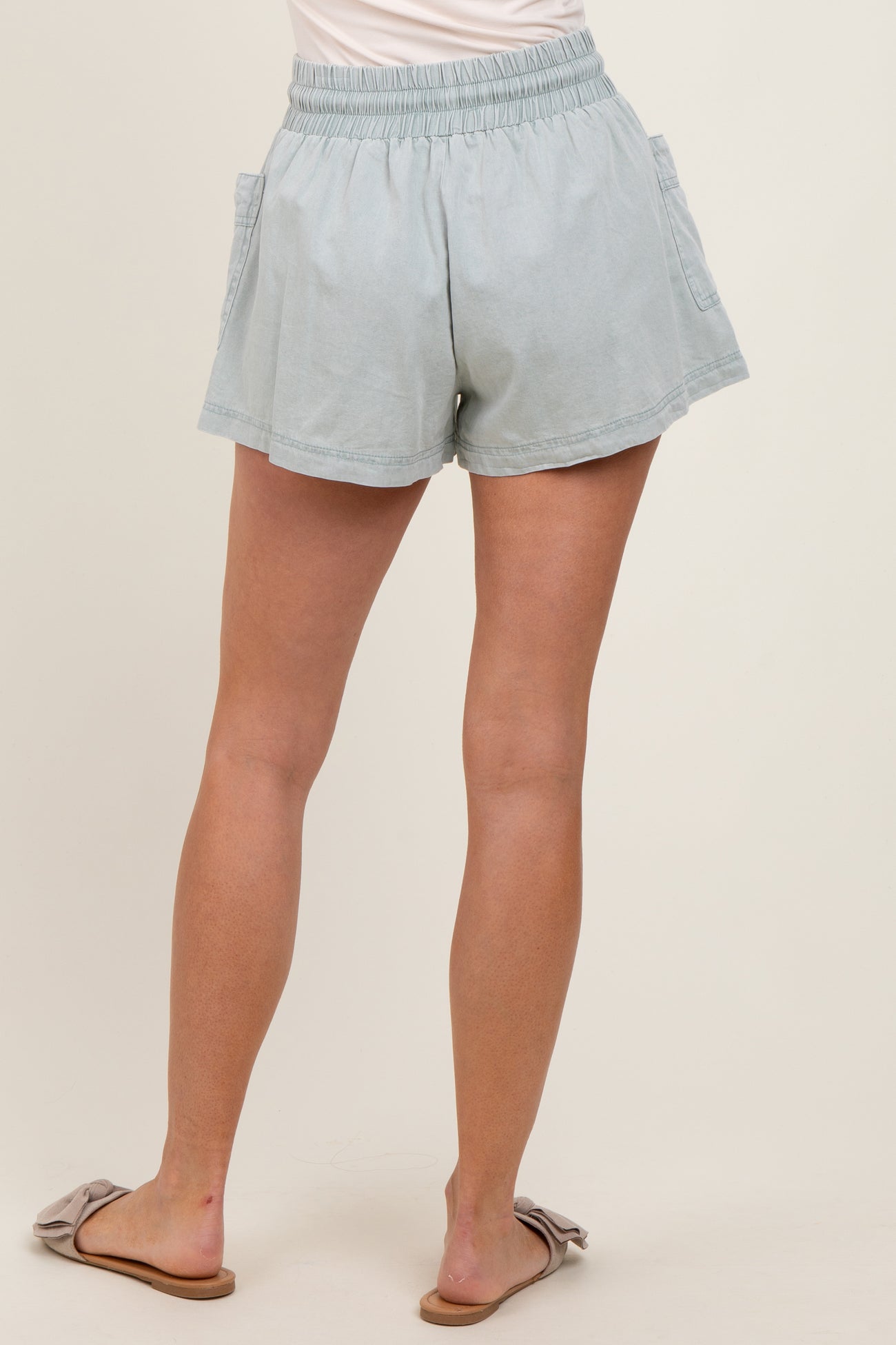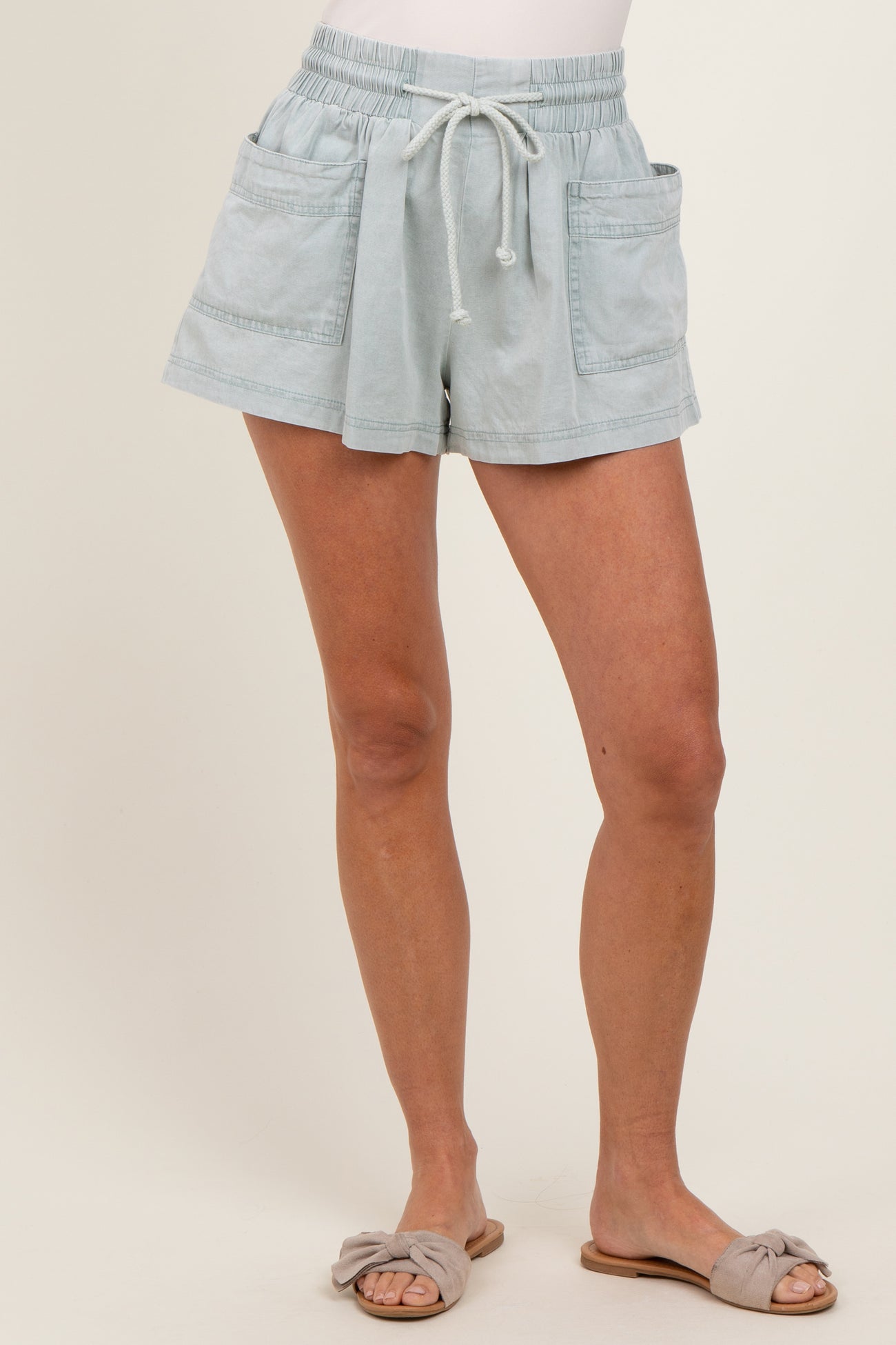 Mint Green Chambray Drawstring Front Pocket Shorts