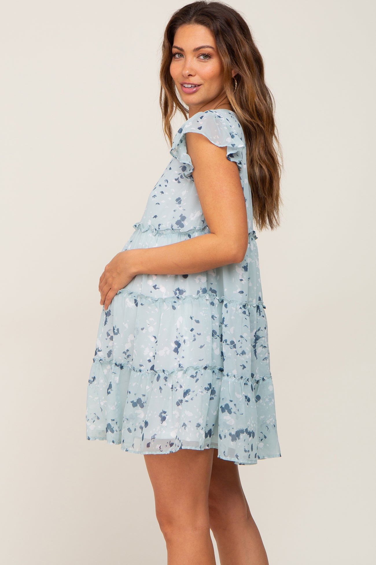 A floral print chiffon maternity dress featuring ruffle sleeves, a rounded neckline, ruffle tiers and double lined.