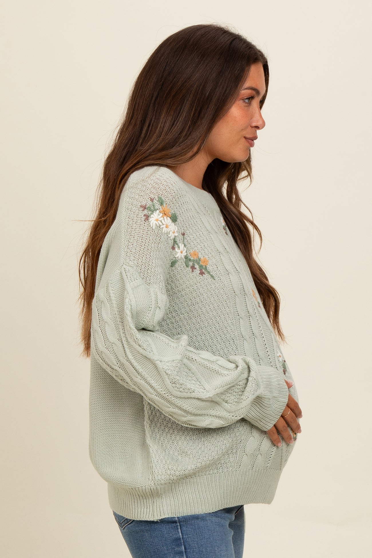 Mint Green Embroidered Flower Cable Knit Maternity Sweater