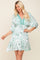 A floral border print dress featuring a v-neckline, 3/4 length dolman sleeves, a back slit with an adjustable tassel tie and double lining.