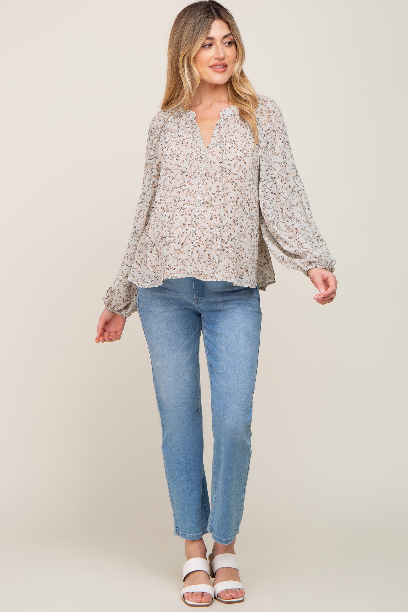 Details A floral maternity blouse with long balloon sleeves, a front neck tie, and front button accents. Top is semi sheer. Content + Care