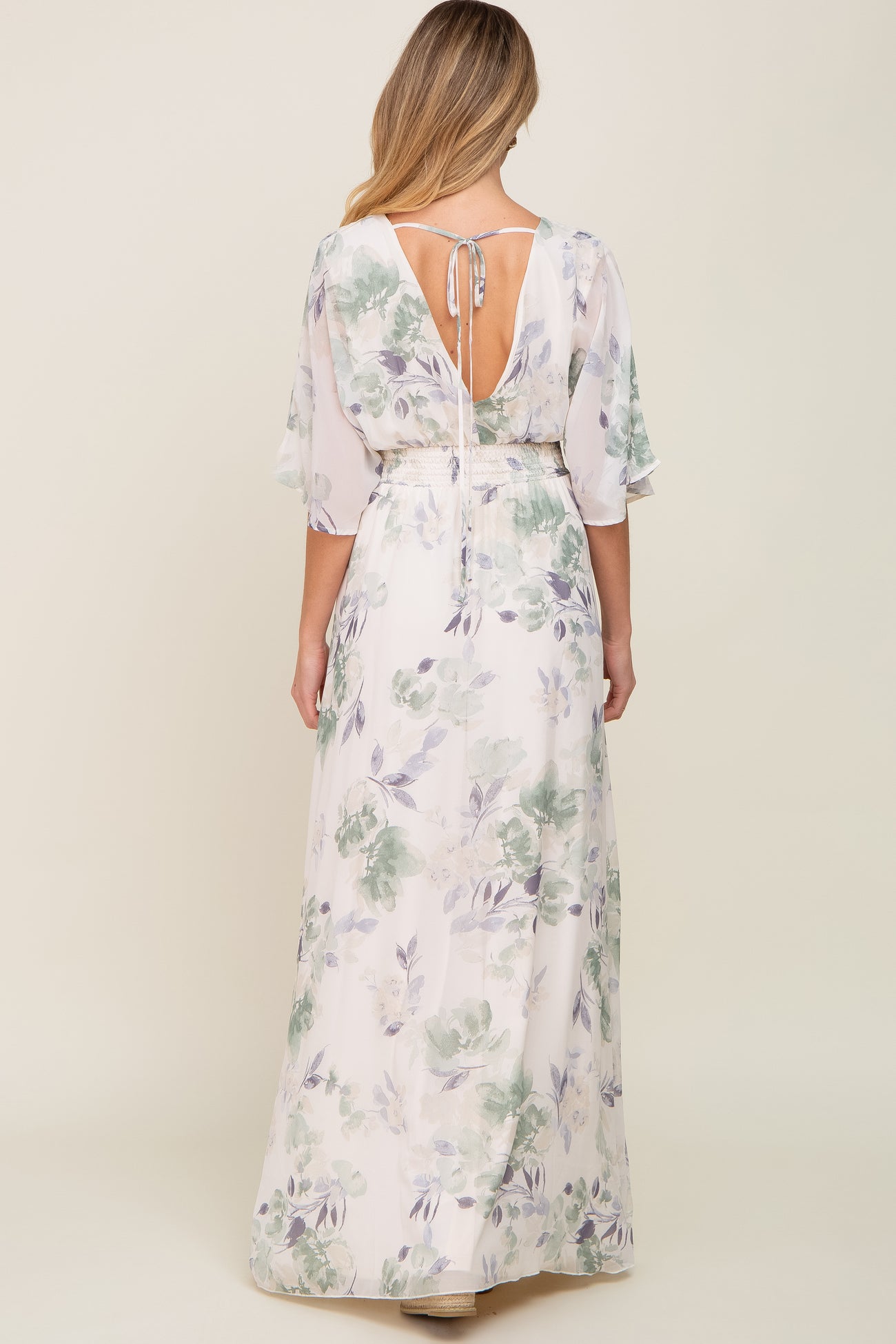 Mint Green Floral Chiffon Double V-Neck Smocked Waist Front Slit Maternity Maxi Dress