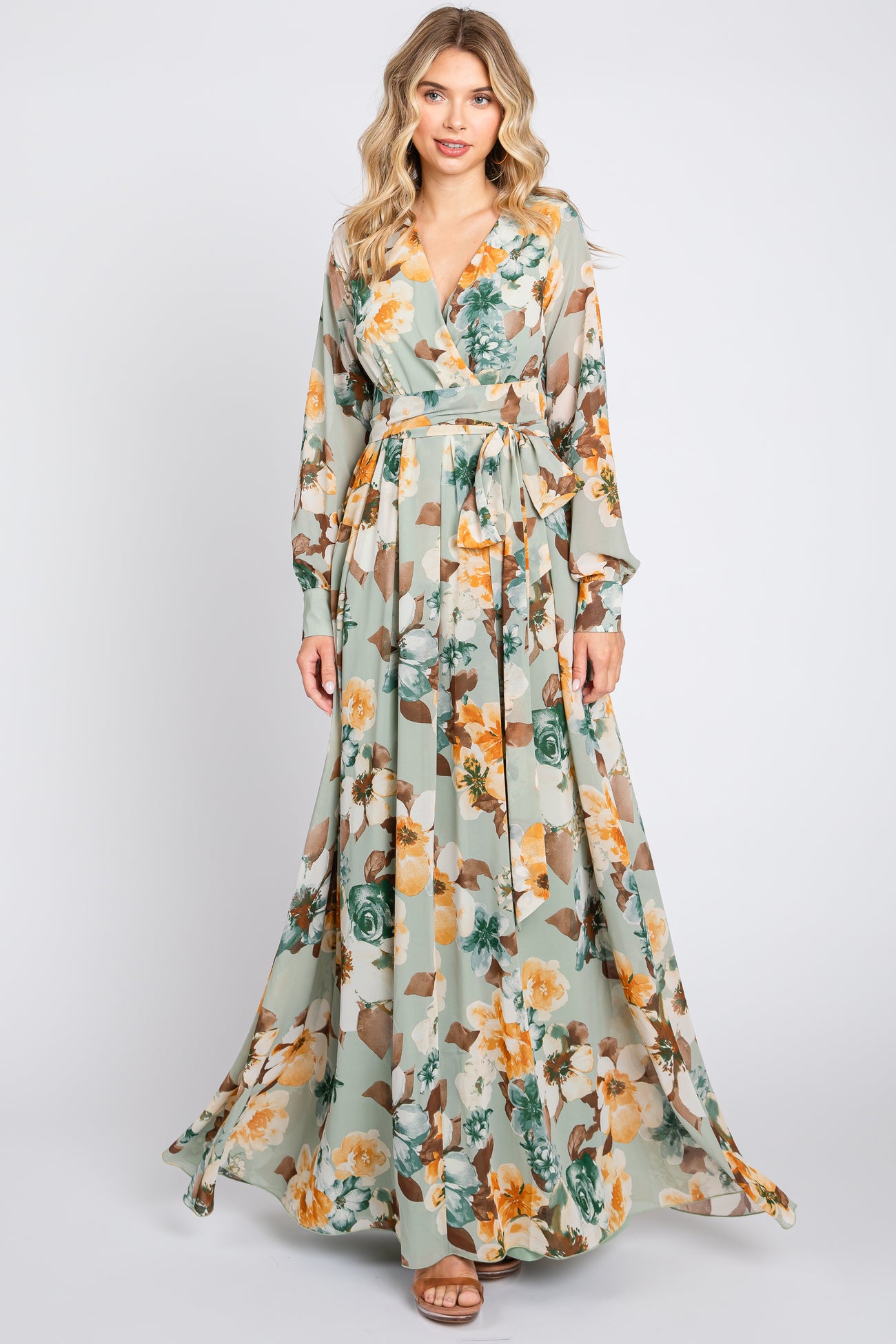 Mint Green Floral Chiffon Wrap Front V-Neck Long Sleeve Maxi Dress