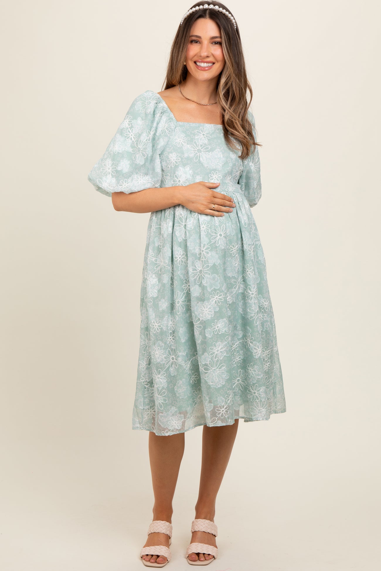 Mint Green Floral Embroidered Short Puff Sleeve Maternity Dress