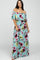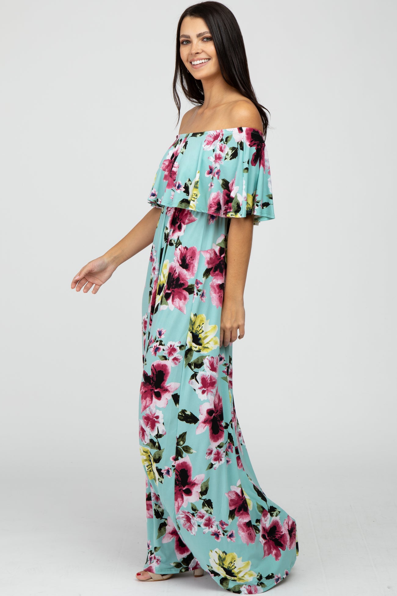 A floral print maxi dress featuring an off shoulder neckline and an empire waist.