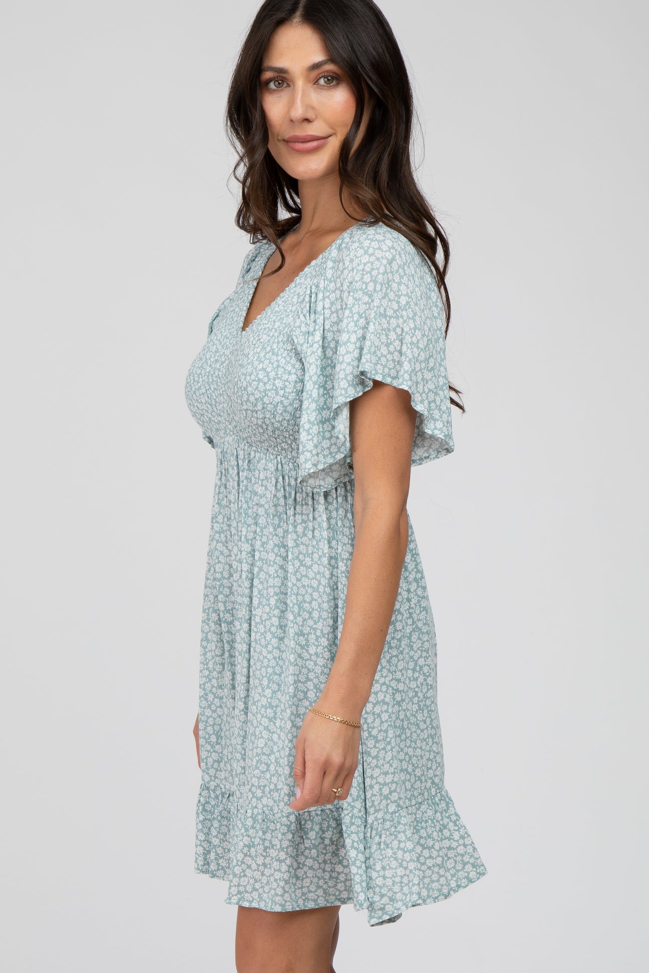 Mint Green Floral Print Smocked V-Neck Dress